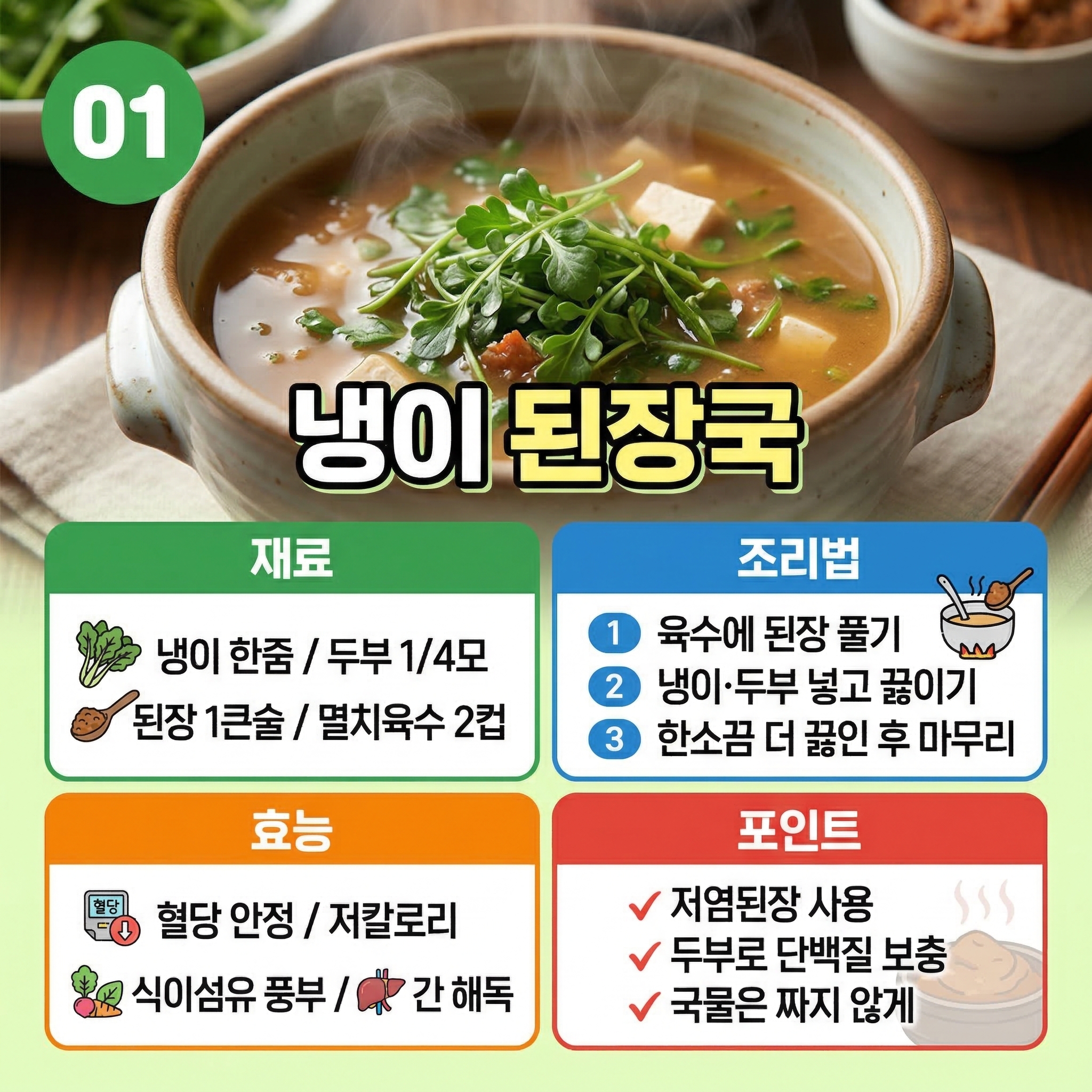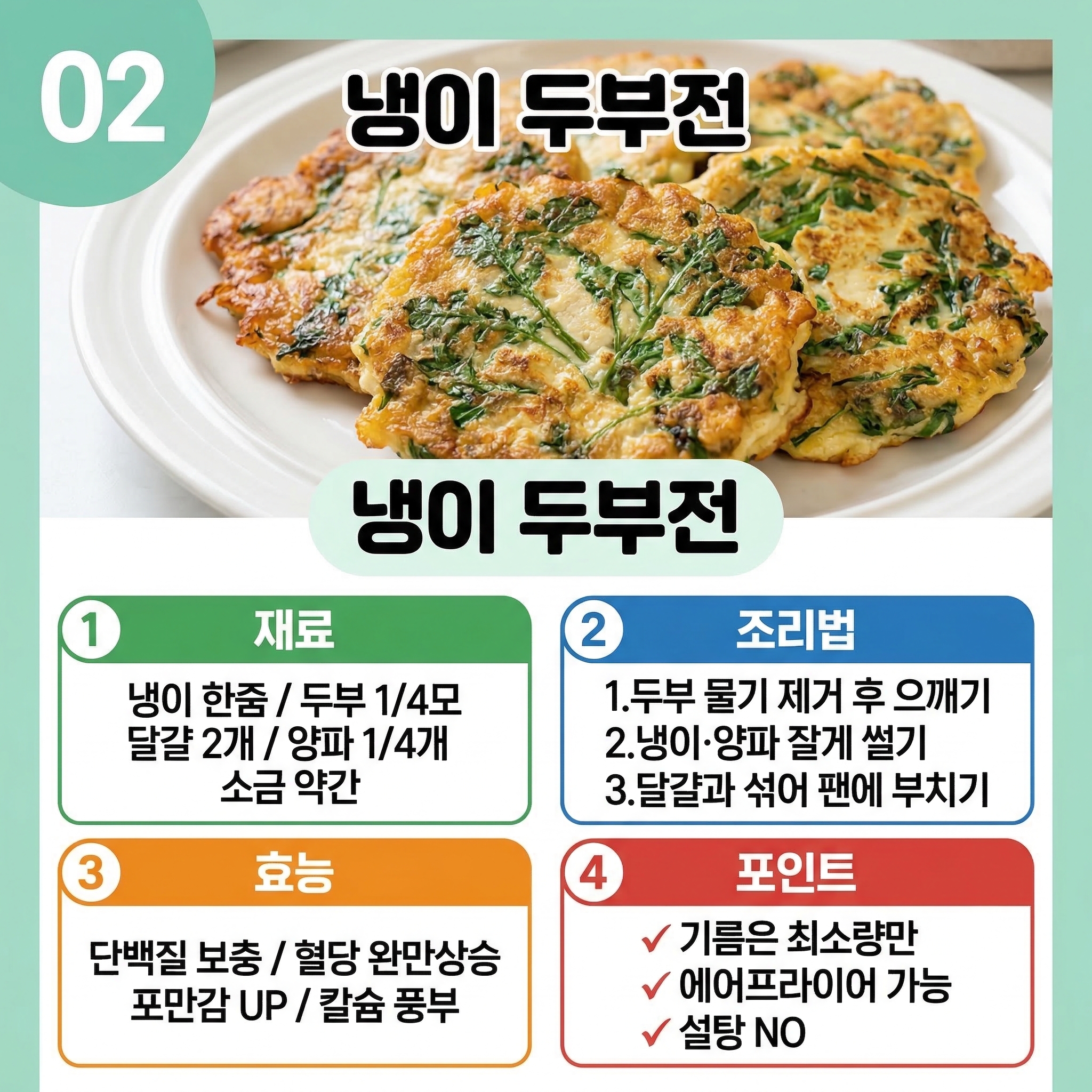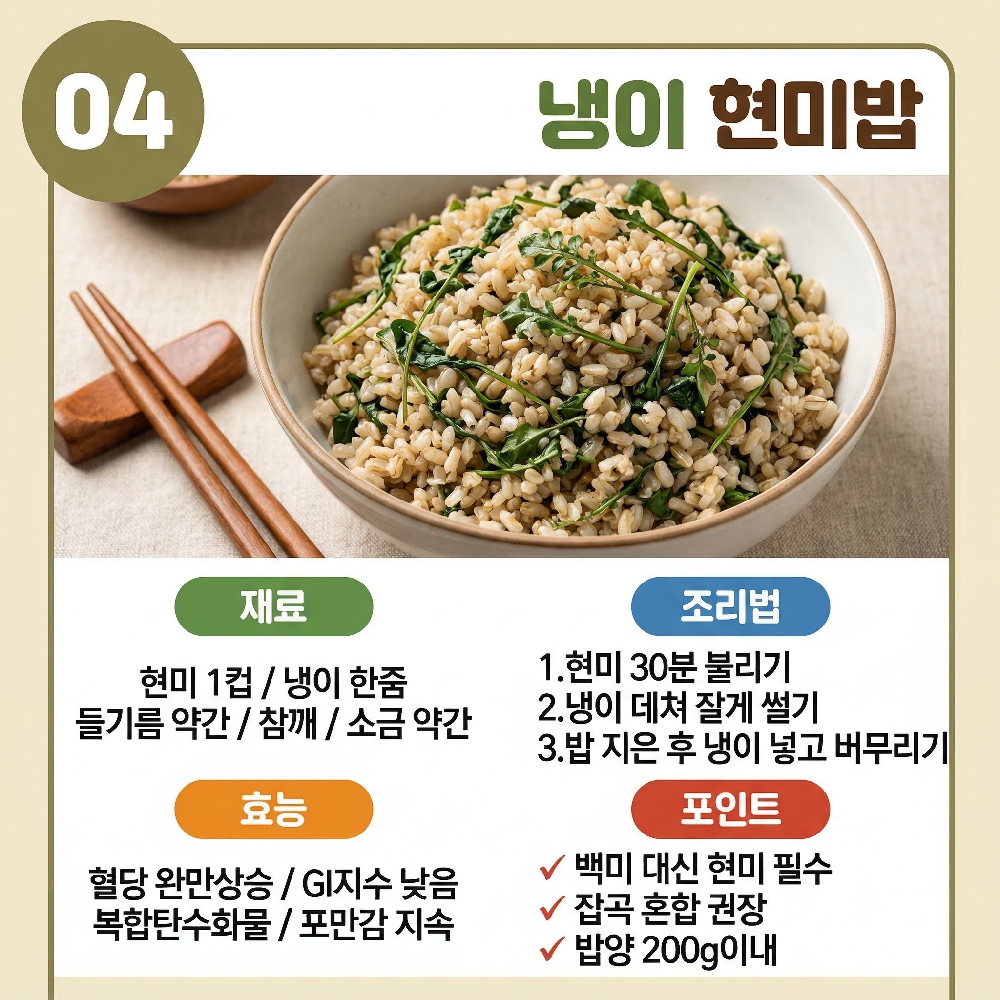 냉이 두부전은 기름을 최소화 하시고, 냉이 현미밥은 드시는 양이 혈당을 결정합니다.