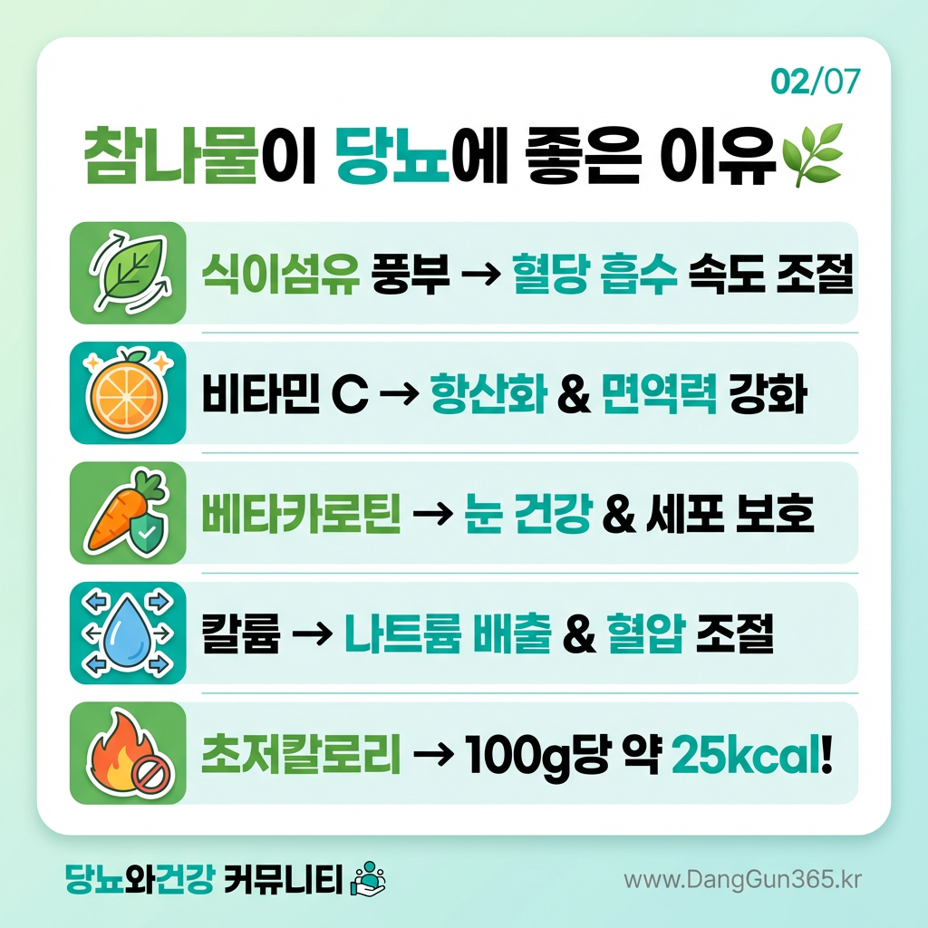 참나물은 100g당 약 25kcal의 초저칼로리 봄나물로, 풍부한 식이섬유가 혈당 흡수 속도를 조절하고, 비타민 C·베타카로틴·칼륨이 항산화와 혈압 조절을 돕습니다.