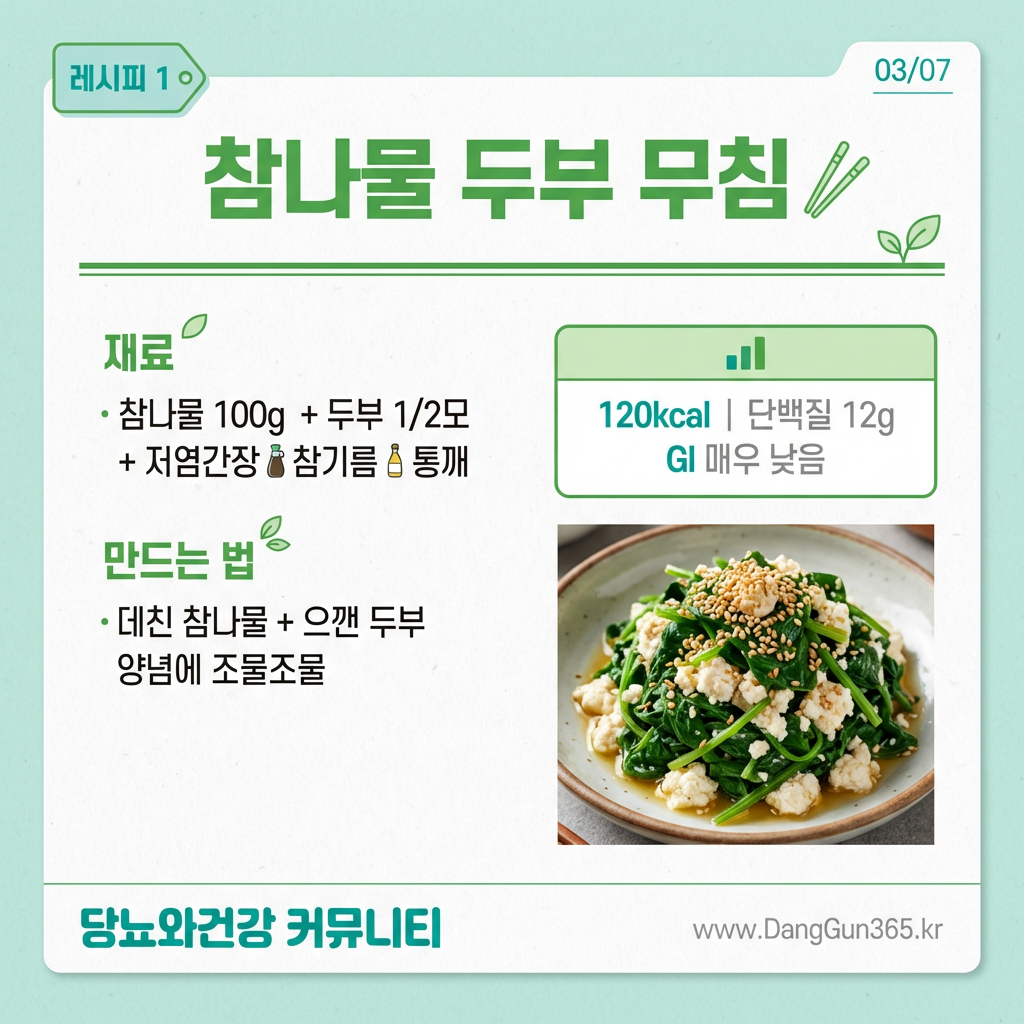 | 1 | 참나물 두부 무침 | 식물성 단백질 듬뿍, 간단 반찬 | 120kcal · 단백질 12g |