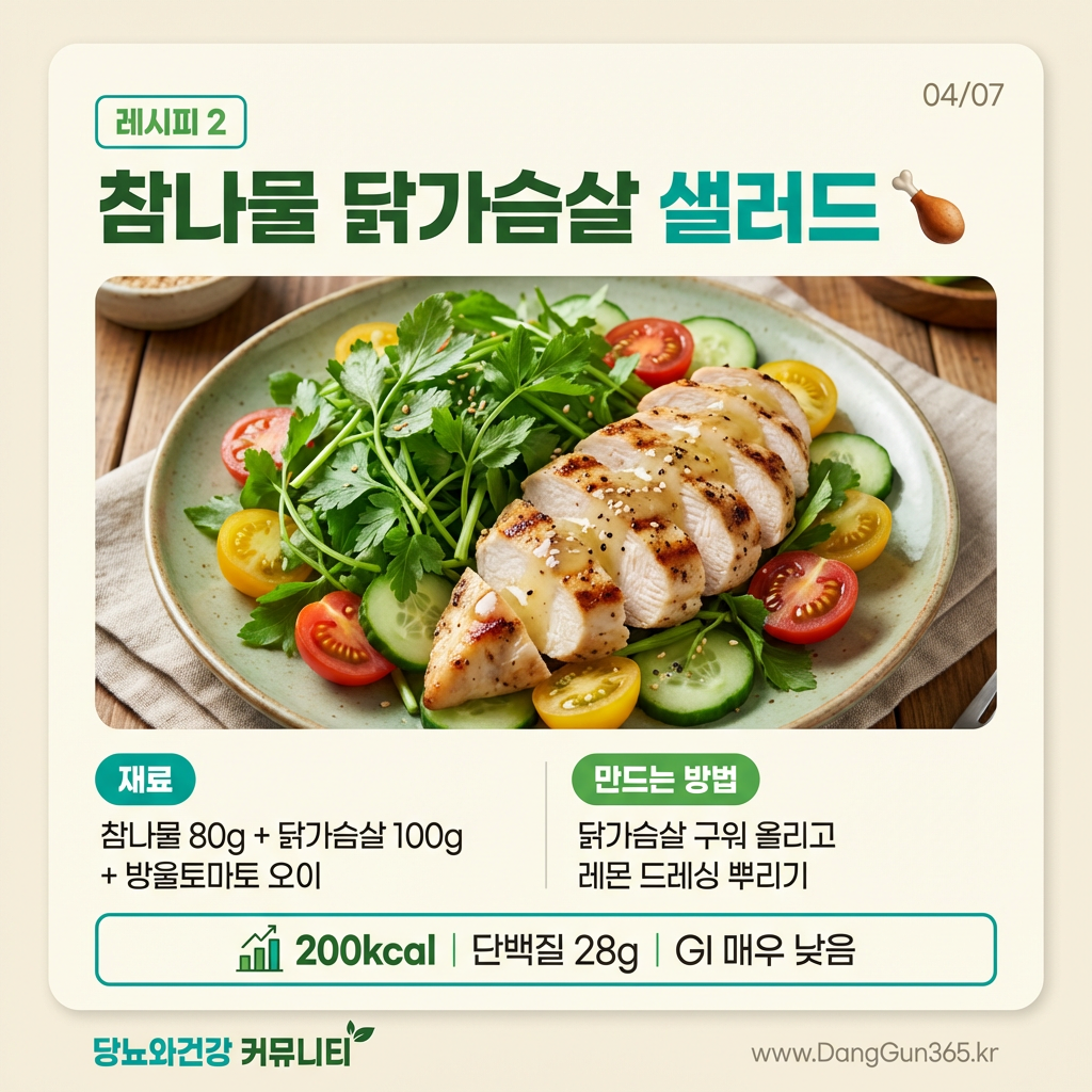 | 2 | 참나물 닭가슴살 샐러드 | 고단백 한 끼 식사 | 200kcal · 단백질 28g |