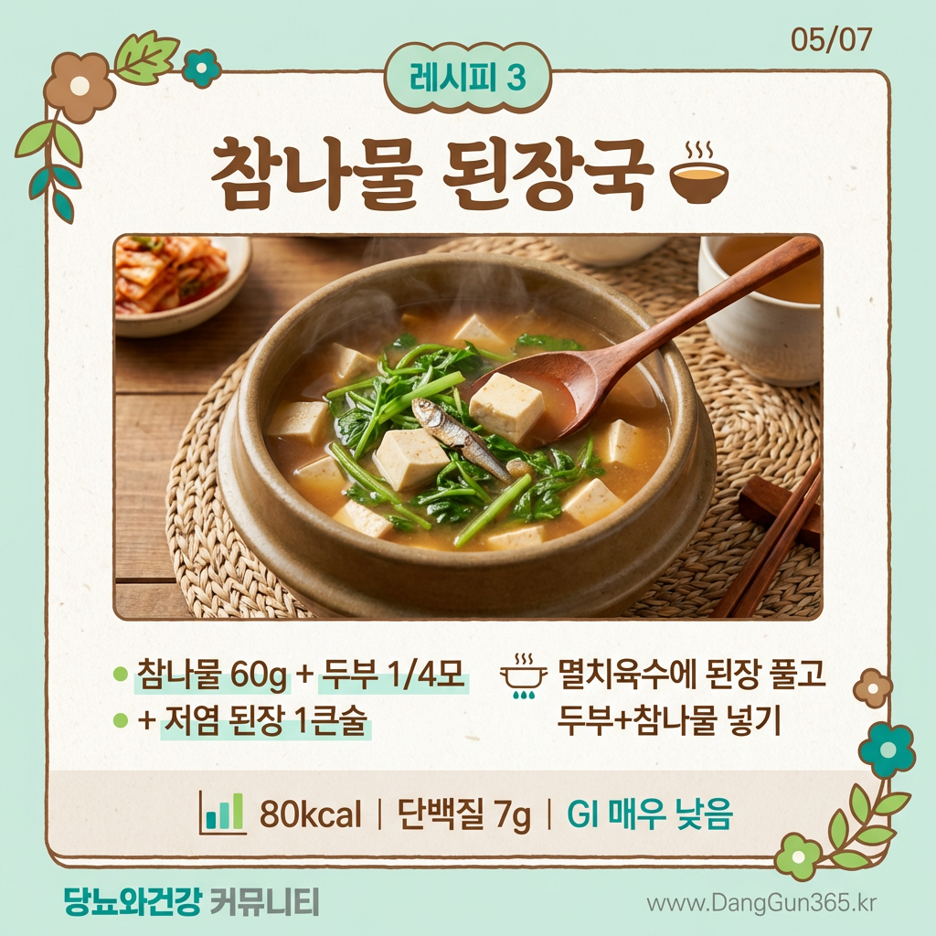 | 3 | 참나물 된장국 | 따뜻한 국물로 포만감 UP | 80kcal · 단백질 7g |