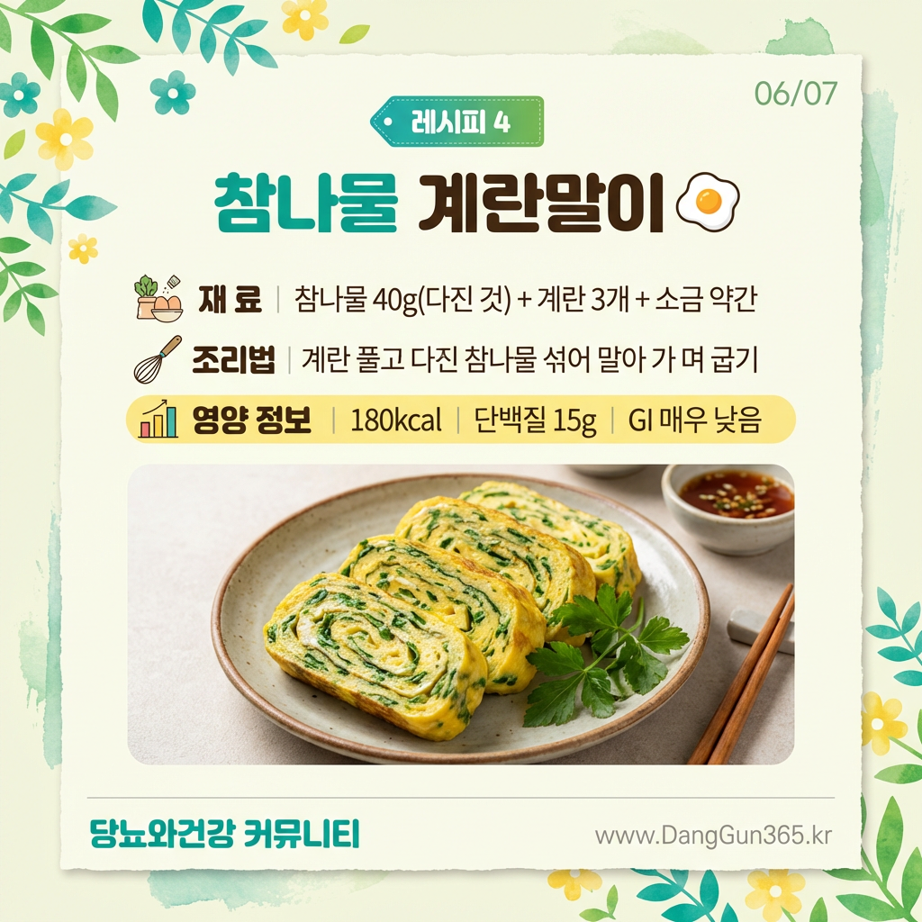 | 4 | 참나물 계란말이 | 아침 식사로 딱! | 180kcal · 단백질 15g |