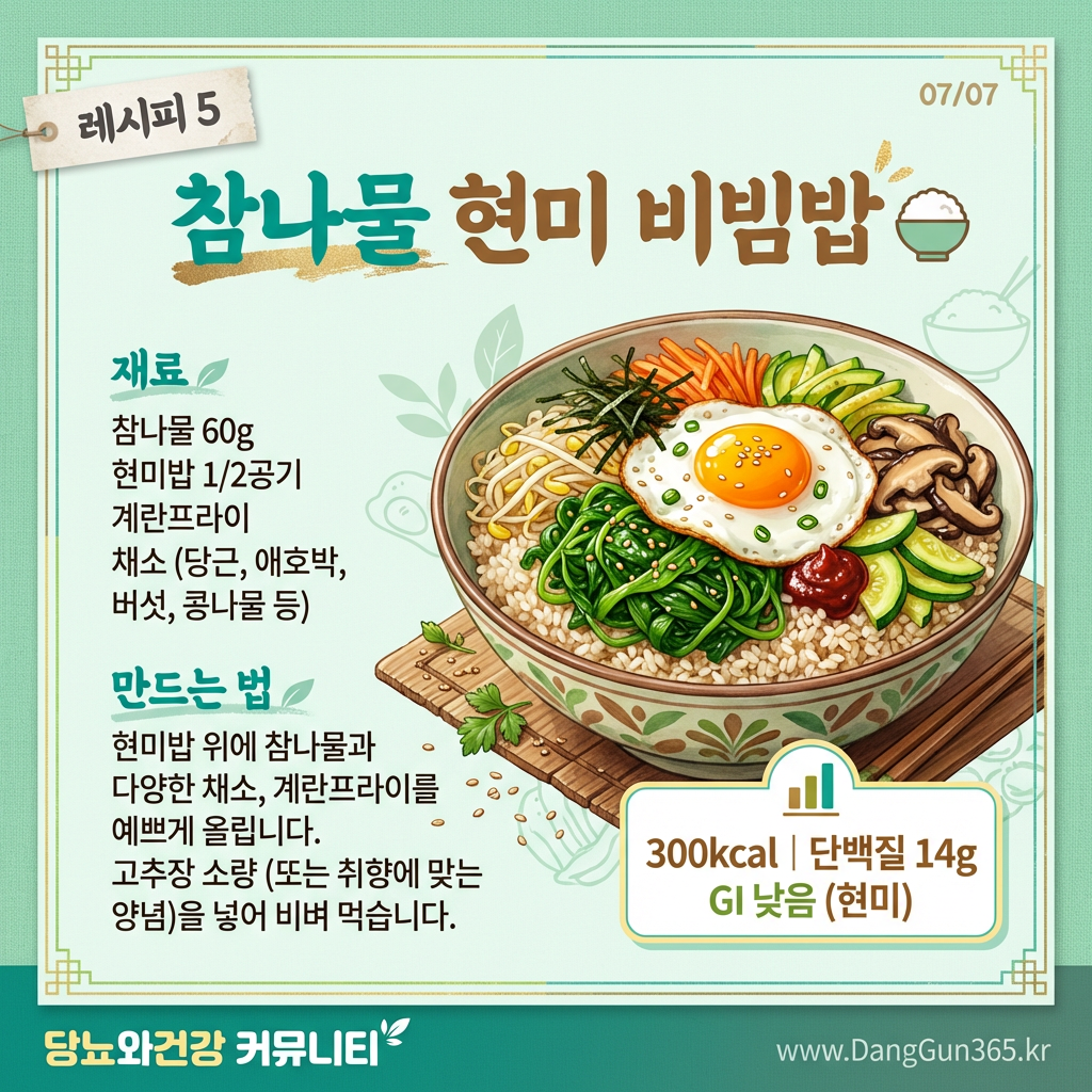 | 5 | 참나물 현미 비빔밥 | 영양 균형 한 그릇 | 300kcal · 단백질 14g |
