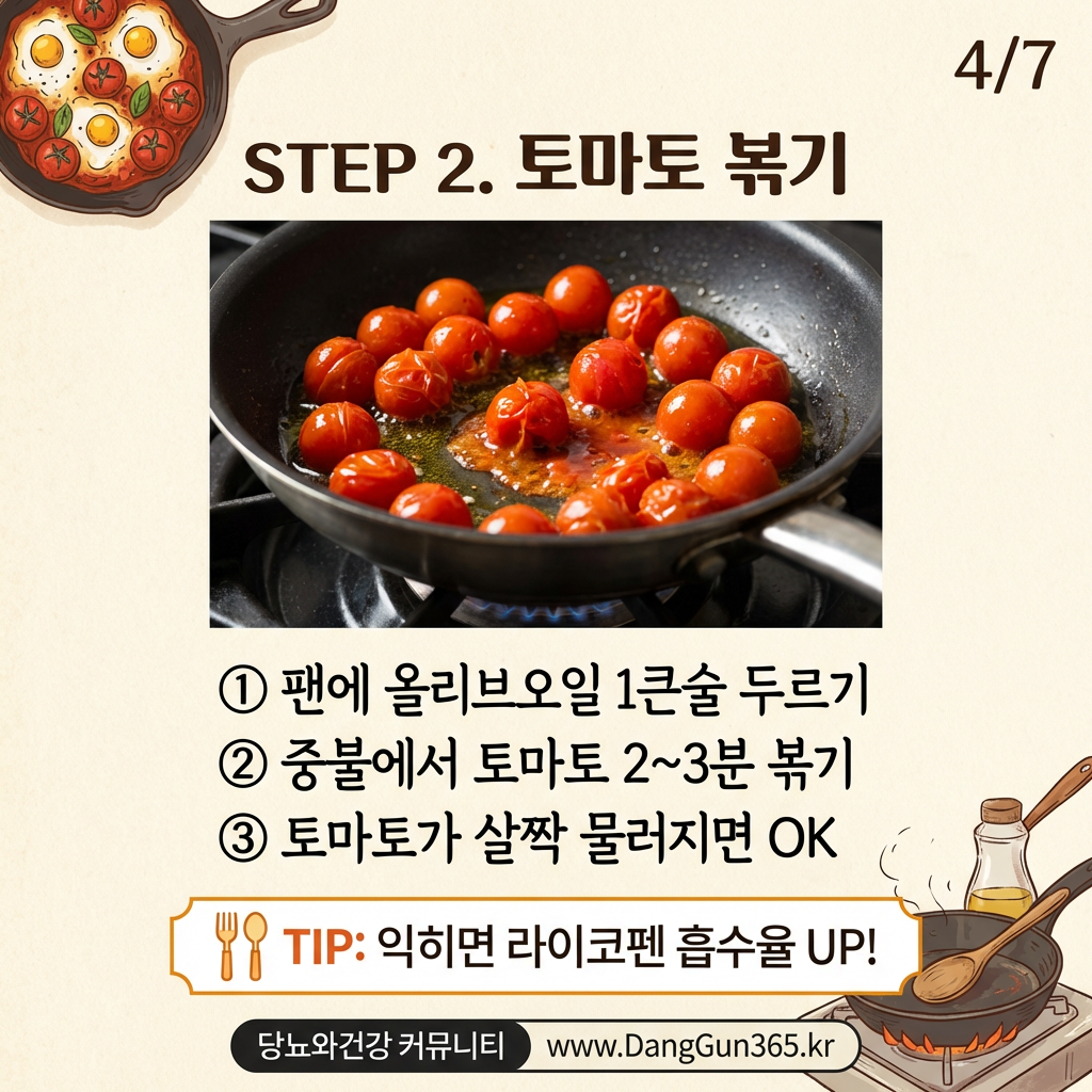 팬에 올리브오일을 두르고 중불에서 토마토를 2~3분간 볶습니다.