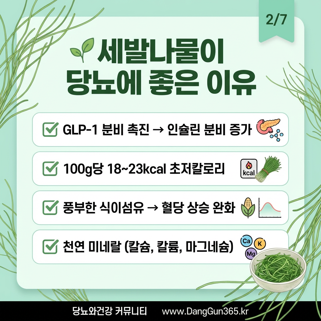 | GLP-1 분비 촉진 | 한국식품연구원 연구 결과, 세발나물 추출물이 장 내분비세포에서 GLP-1 호르몬 분비를 증가시켜 인슐린 분비를 돕고 혈당을 낮춤 |