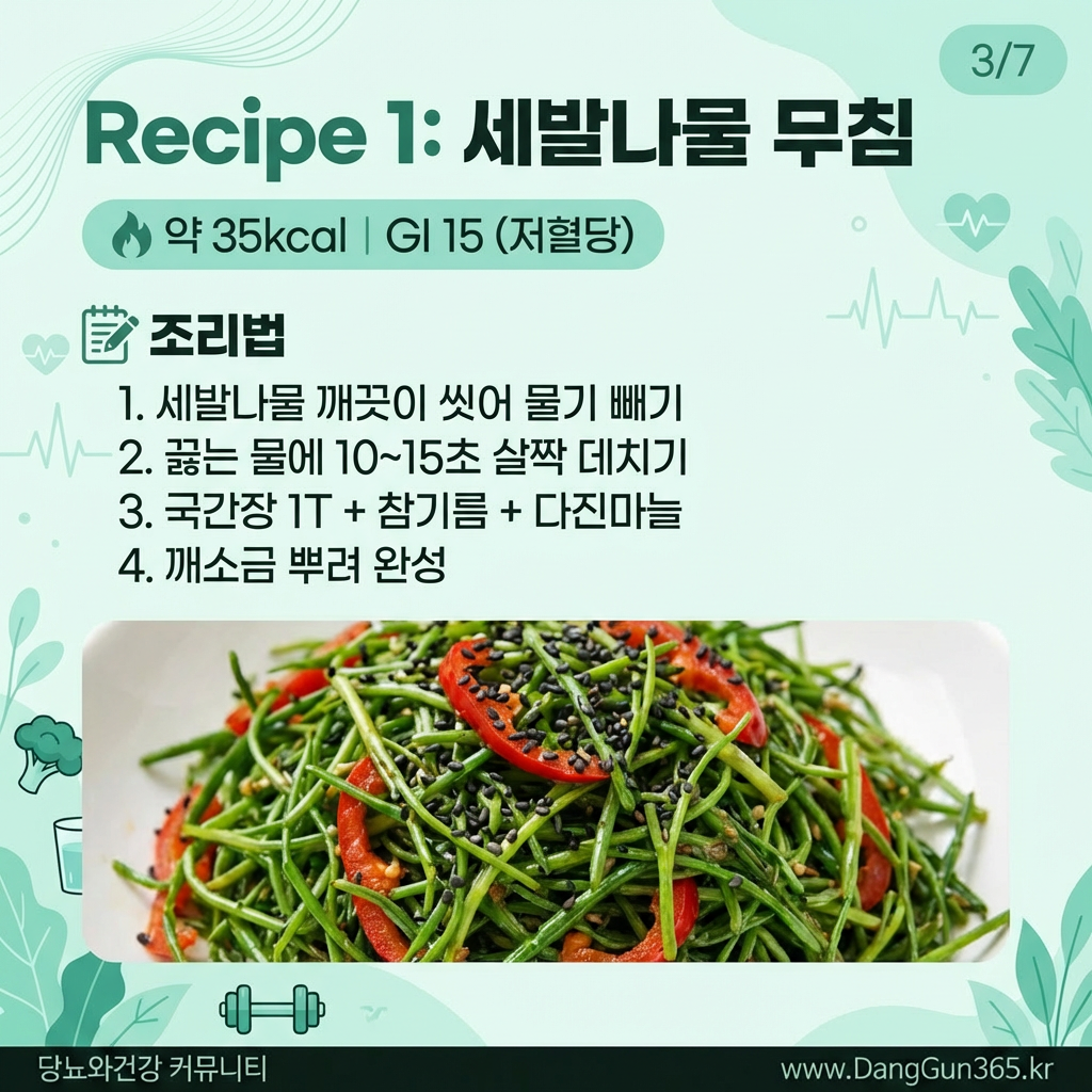 | 세발나물 무침 | 35kcal | 15 | 기본 반찬, 간단 조리 |