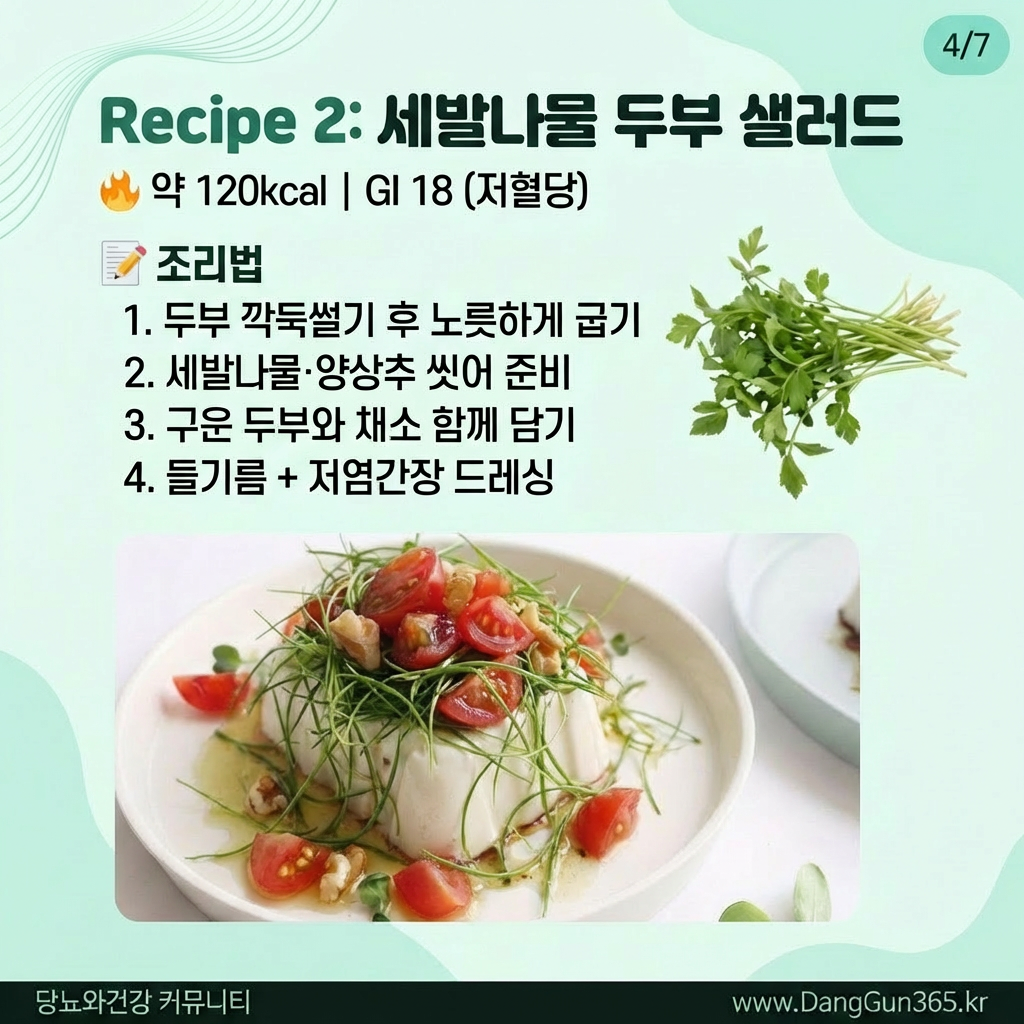 | 세발나물 두부 샐러드 | 120kcal | 18 | 고단백, 한 끼 대용 |