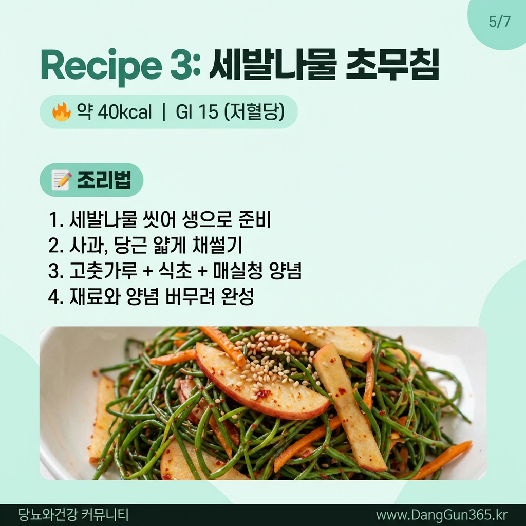 | 세발나물 초무침 | 40kcal | 15 | 새콤달콤, 입맛 돋움 |