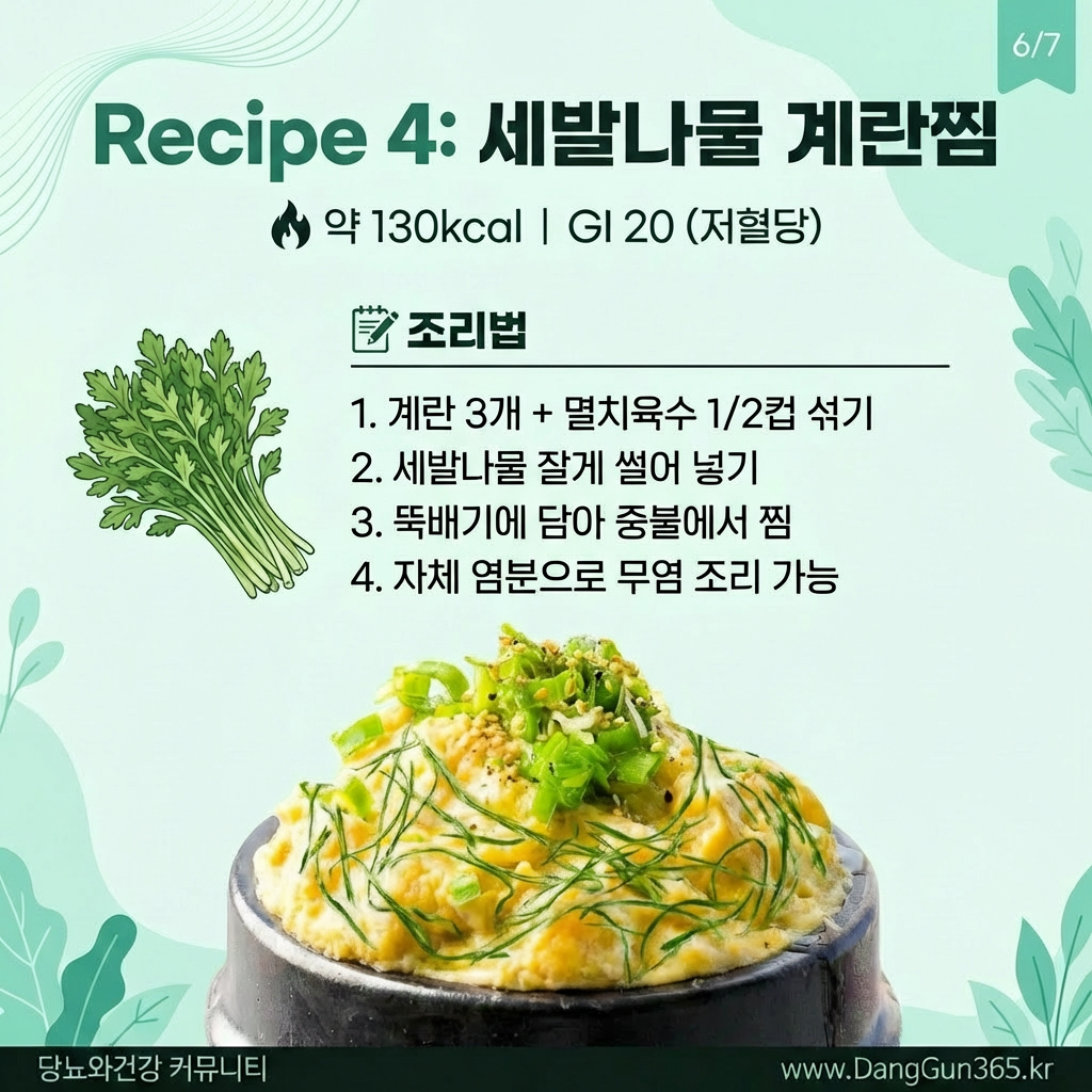 | 세발나물 계란찜 | 130kcal | 20 | 무염 조리 가능 |