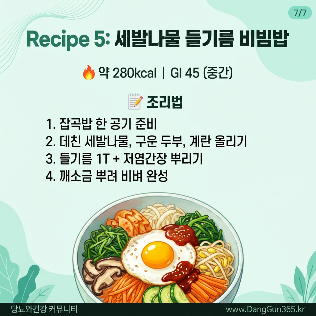 | 세발나물 들기름 비빔밥 | 280kcal | 45 | 든든한 한 끼 |