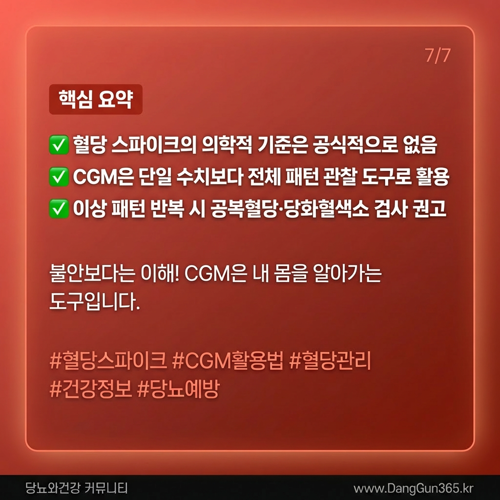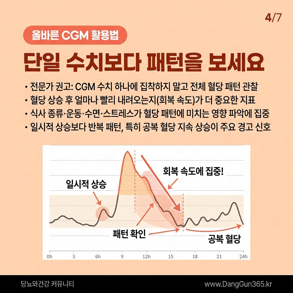 전문가들은 CGM을 사용할 때 특정 시점의 최고 수치 하나에 집착하지 말 것을 권고합니다. 대신 전체적인 혈당의 흐름(패턴)을 관찰해야 합니다.