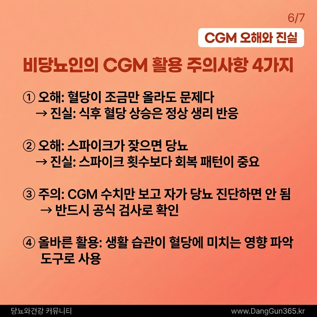 CGM 수치만 보고 스스로 당뇨병을 진단해서는 안 됩니다. CGM은 오차가 있을 수 있으므로, 반드시 병원의 표준 검사법으로 확진해야 합니다.