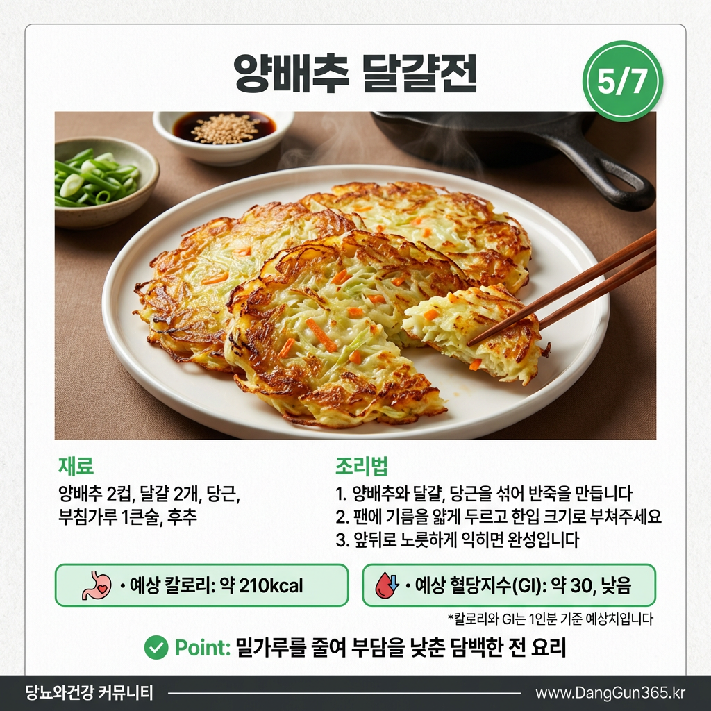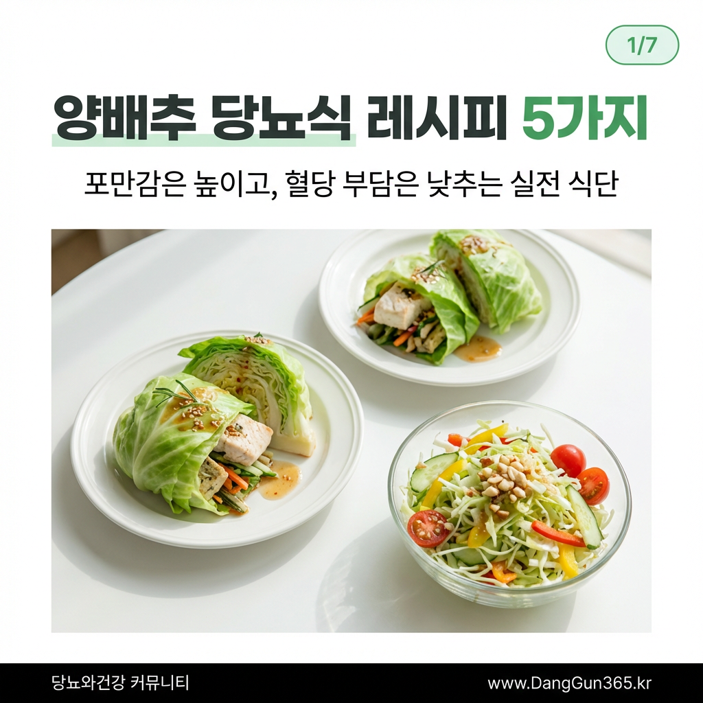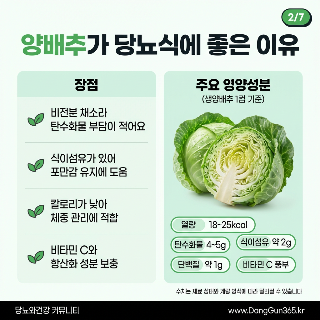 양배추는 당뇨식에 활용하기 좋은 대표 비전분 채소라서, 식사량은 든든하게 가져가면서도 탄수화물 부담을 상대적으로 낮추기 좋습니다. 미국당뇨병협회는 양배추를 비전분 채소로 분류하고, 비전분 채소는 칼로리·탄수화물이 적고 식이섬유와 미량영양소를 공급한다고 안내합니다. CDC도 당뇨 식사에서 접시의 절반을 비전분 채소로 채우는 방식을 권합니다.