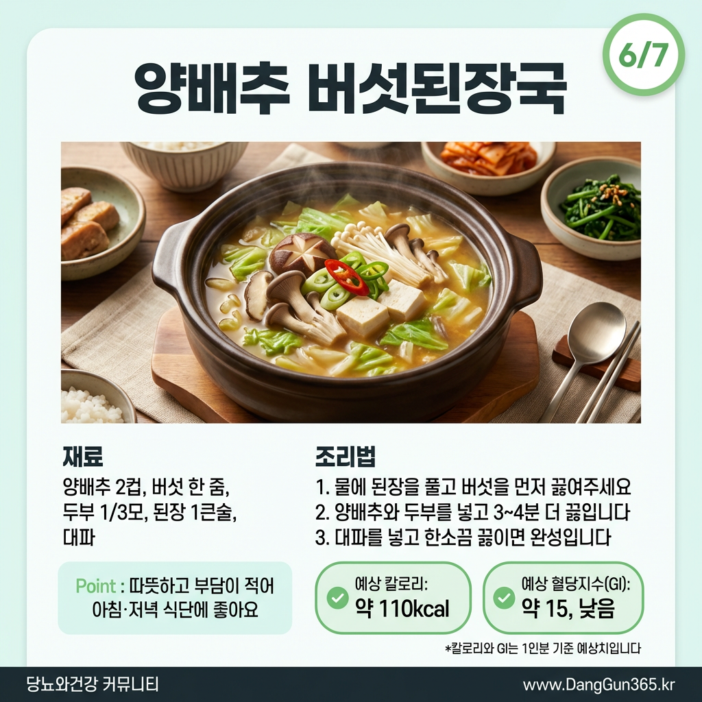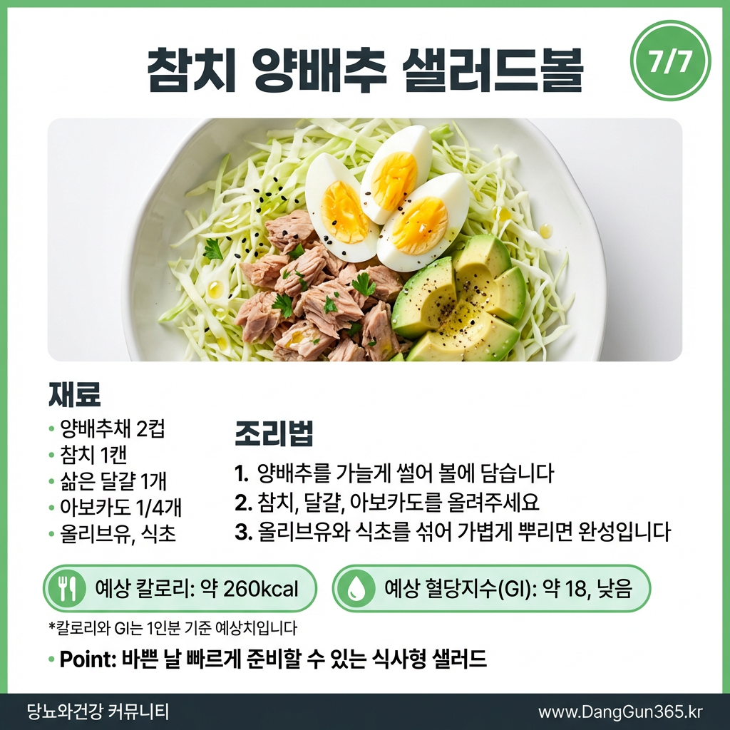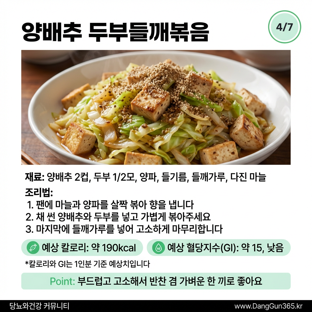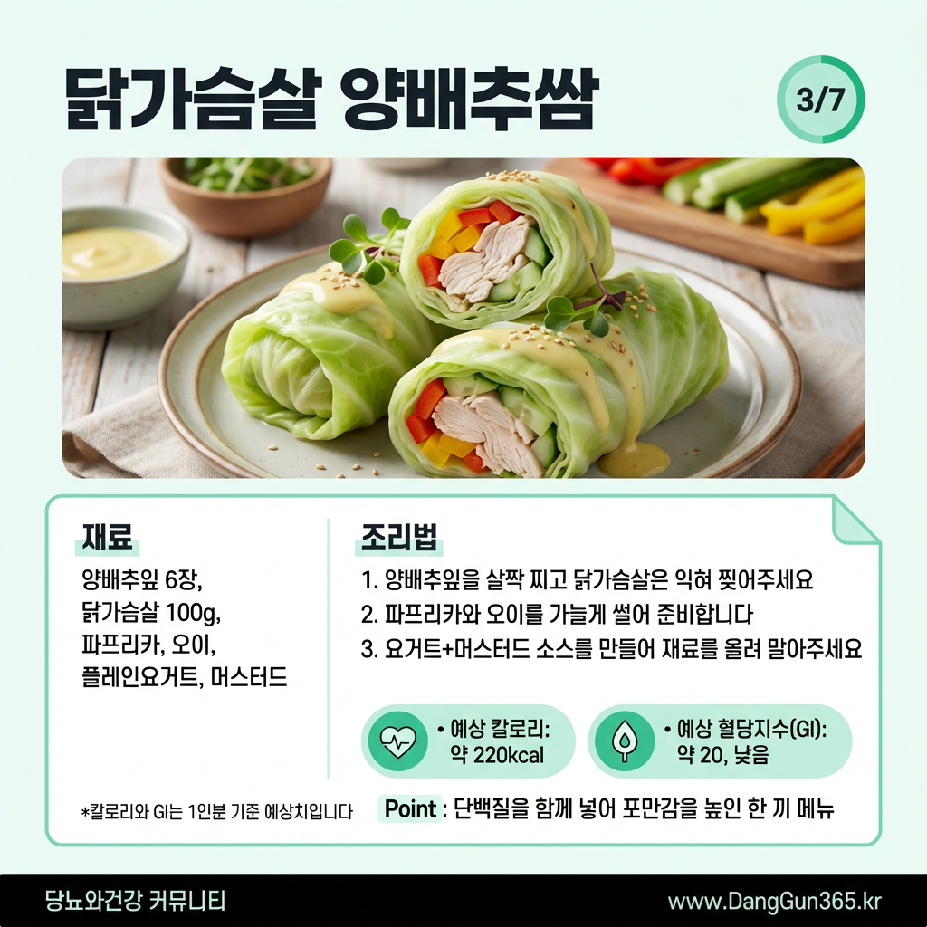 양배추는 당뇨식에 활용하기 좋은 대표 비전분 채소라서, 식사량은 든든하게 가져가면서도 탄수화물 부담을 상대적으로 낮추기 좋습니다. 미국당뇨병협회는 양배추를 비전분 채소로 분류하고, 비전분 채소는 칼로리·탄수화물이 적고 식이섬유와 미량영양소를 공급한다고 안내합니다. CDC도 당뇨 식사에서 접시의 절반을 비전분 채소로 채우는 방식을 권합니다.