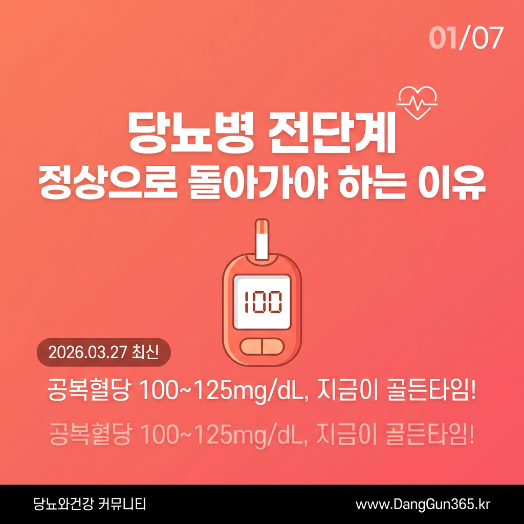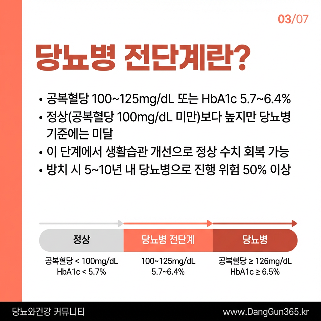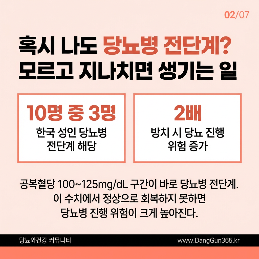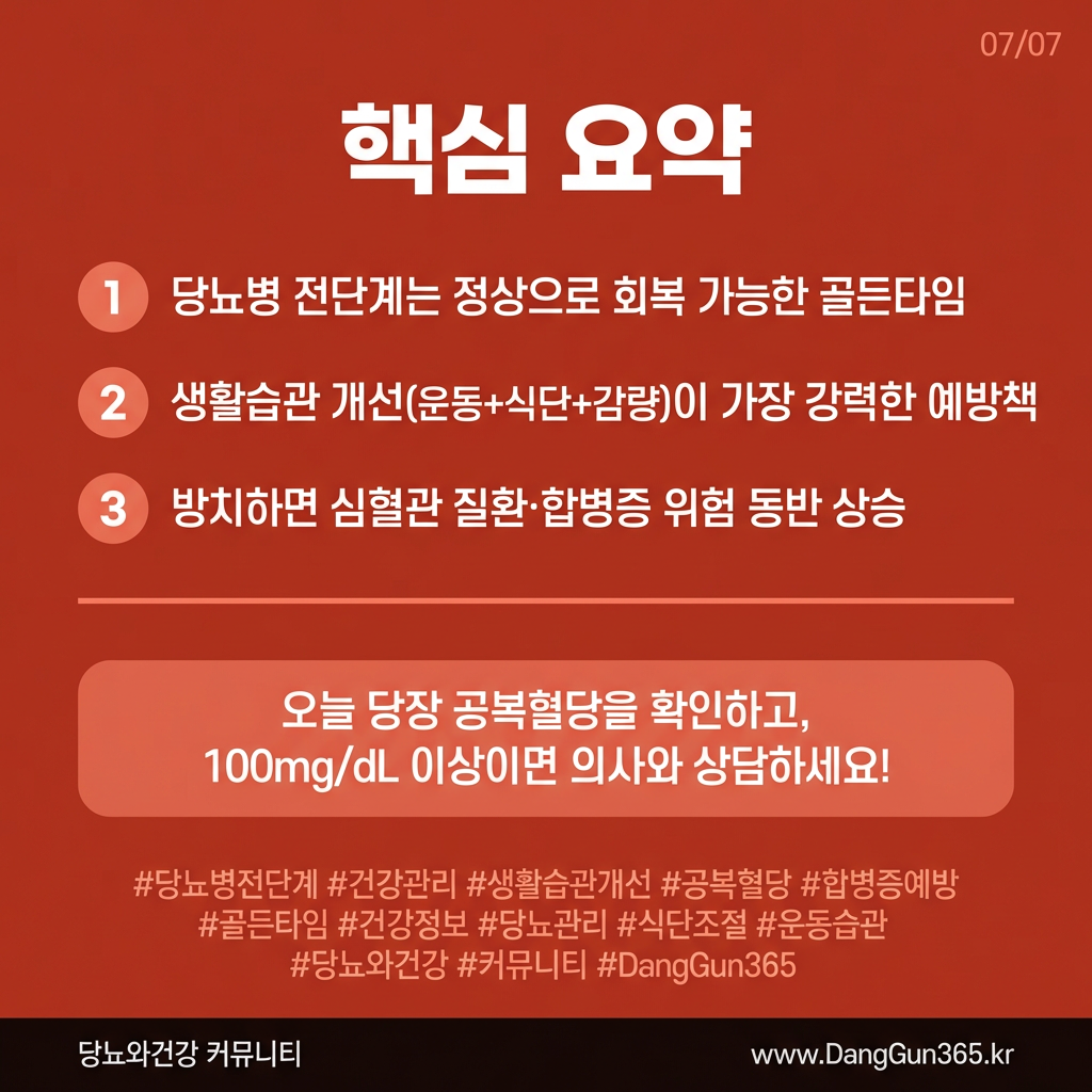 공복혈당이 100~125mg/dL 사이에 해당하는 당뇨병 전단계(prediabetes)는, 아직 당뇨병으로 진단받지 않은 상태임에도 불구하고 적극적인 관리가 반드시 필요한 시점이다. 전문가들은 이 시기를 '당뇨병 발병을 막을 수 있는 골든타임'으로 정의하고 있다.