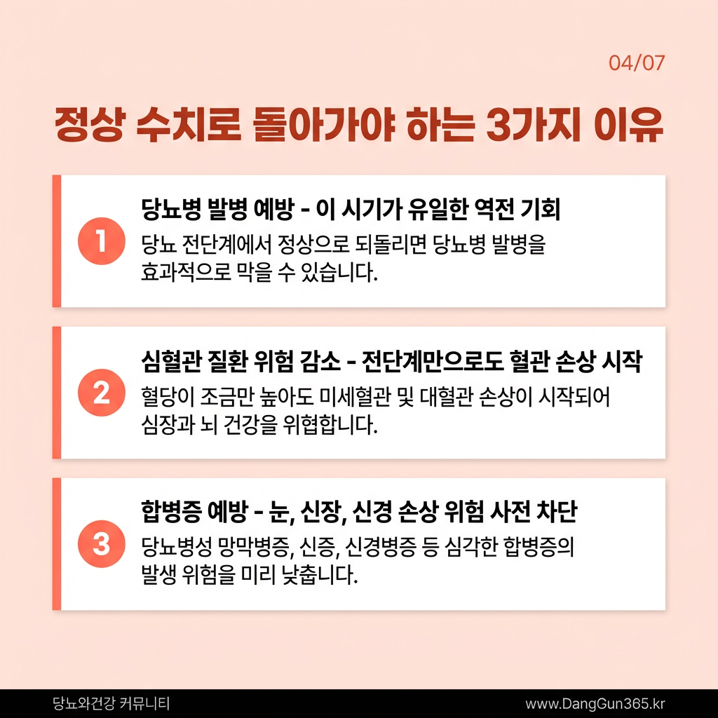 정상 수치로 돌아가야 하는 핵심 이유는 크게 세 가지로 정리할 수 있다. 첫째, 당뇨병 전단계는 생활습관 개선만으로도 정상 수치 회복이 가능한 유일한 구간이다. 둘째, 이 시기에 심혈관 질환과 각종 합병증의 위험을 선제적으로 차단할 수 있다. 셋째, 정상 수치로 회복하면 이후 당뇨병 발병 위험이 현저히 낮아진다.