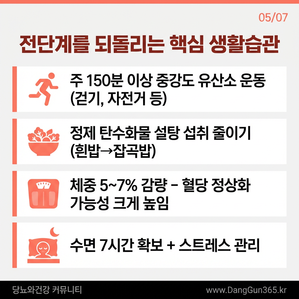전단계에서 정상 혈당으로 회복하기 위한 가장 효과적인 방법은 생활습관 개선이다. 주 150분 이상의 중강도 유산소 운동(빠른 걷기, 자전거 등), 정제 탄수화물과 당류 섭취 감소, 체중의 5~7% 감량이 혈당 정상화에 결정적인 역할을 한다. 실제로 체중을 5% 이상 줄인 경우 당뇨 진행 위험을 절반 이하로 낮출 수 있다는 연구 결과가 존재한다.