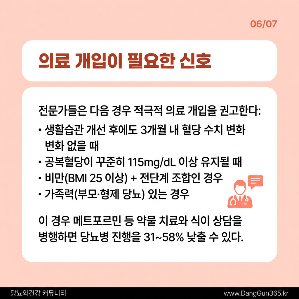 단, 생활습관 개선만으로 3개월 이상 혈당 변화가 없거나, 공복혈당이 지속적으로 115mg/dL 이상을 유지하는 경우, 비만이나 강한 가족력을 가진 경우에는 전문의와의 상담을 통해 약물 치료 병행 여부를 결정하는 것이 바람직하다. 메트포르민 등 약물 치료를 생활습관 개선과 병행할 경우 당뇨병 진행 위험을 31~58%까지 낮출 수 있다는 임상 근거가 있다.