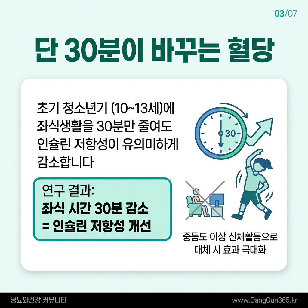 최근 발표된 연구에 따르면, 초기 청소년기(10~13세)에 좌식 생활을 하루 단 30분만 줄여도 인슐린 저항성이 유의미하게 낮아지는 것으로 나타났다. 연구진은 이 연령대의 청소년 수백 명을 대상으로 신체활동 패턴과 혈당 지표를 추적 관찰한 결과, 좌식 시간을 30분 줄이고 중등도 이상의 신체활동으로 대체하였을 때 인슐린 저항성 개선 효과가 더욱 극대화됨을 확인하였다.