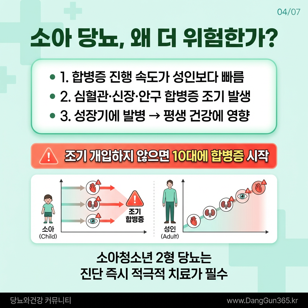 소아청소년 당뇨병은 성인 당뇨병에 비해 합병증 진행 속도가 빠르고 치명적으로 나타나는 경향이 있다. 심혈관계 질환, 신장 손상, 안구 합병증 등이 조기에 발생할 수 있으며, 성장기에 발병하면 평생 건강에 지대한 영향을 미칠 수 있다. 이 때문에 전문가들은 소아청소년 당뇨병의 경우 조기 개입이 무엇보다 중요하다고 강조하고 있다.