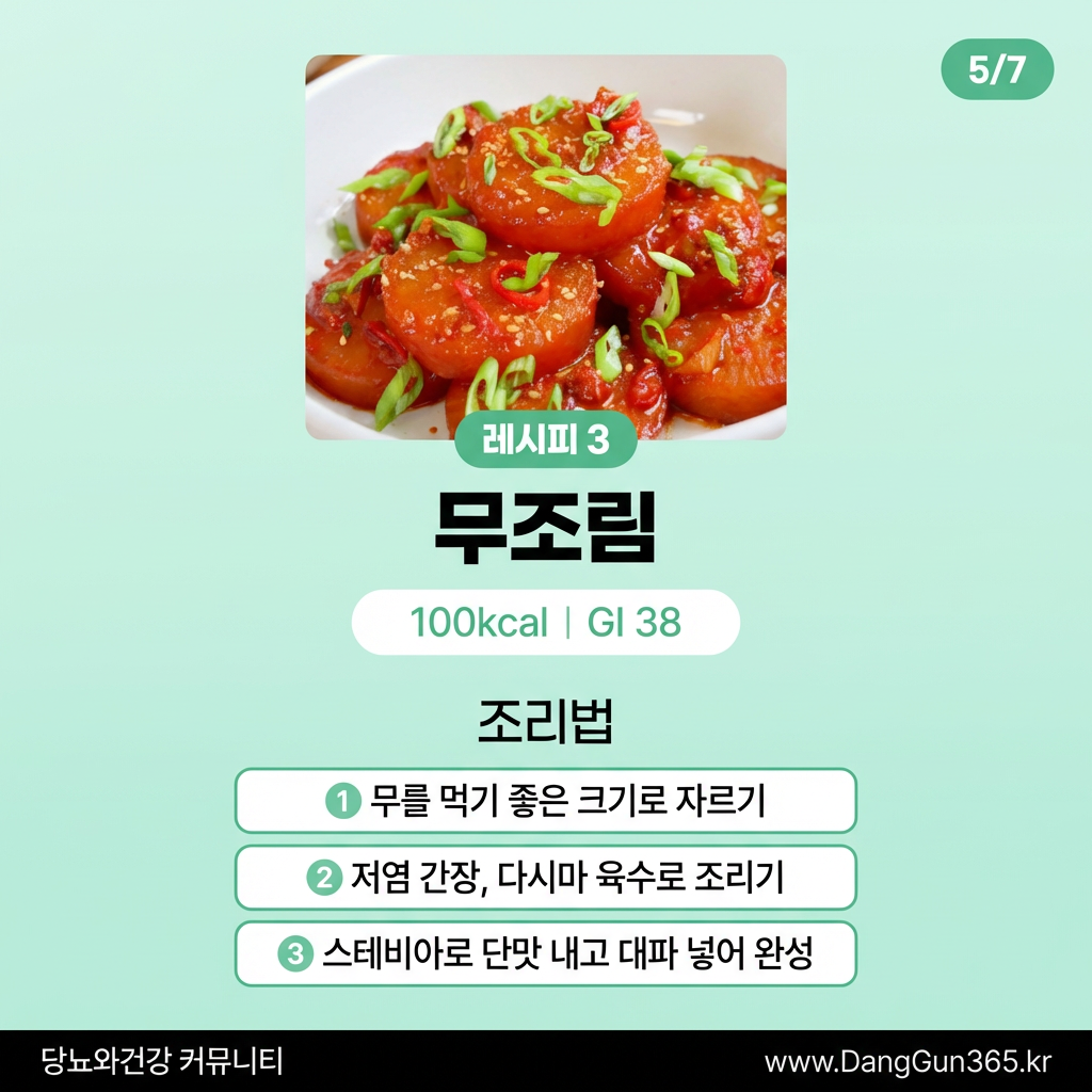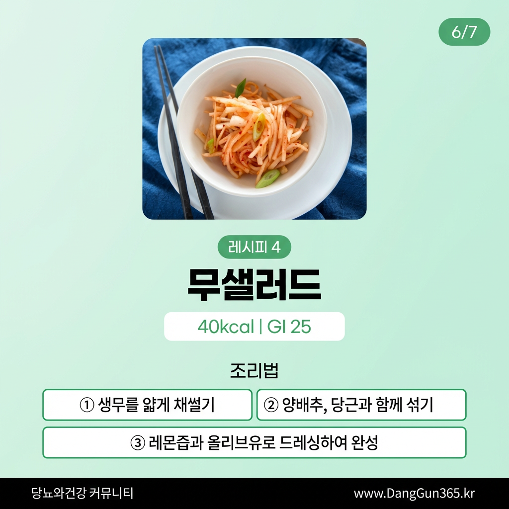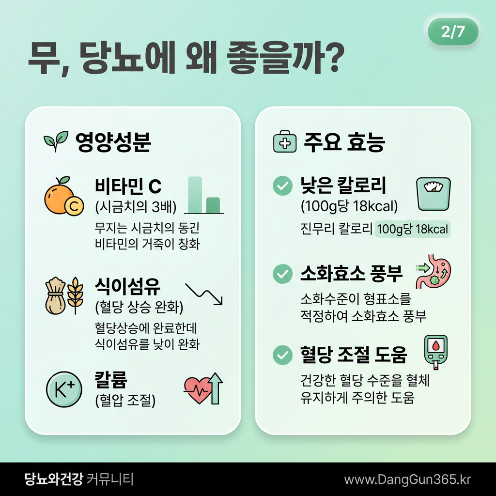 무는 수분 함량이 높고(약 95%), 칼로리가 낮으며(100g당 약 18kcal), 소화효소인 디아스타아제가 풍부해 당뇨 환자분들께 좋은 식재료입니다.