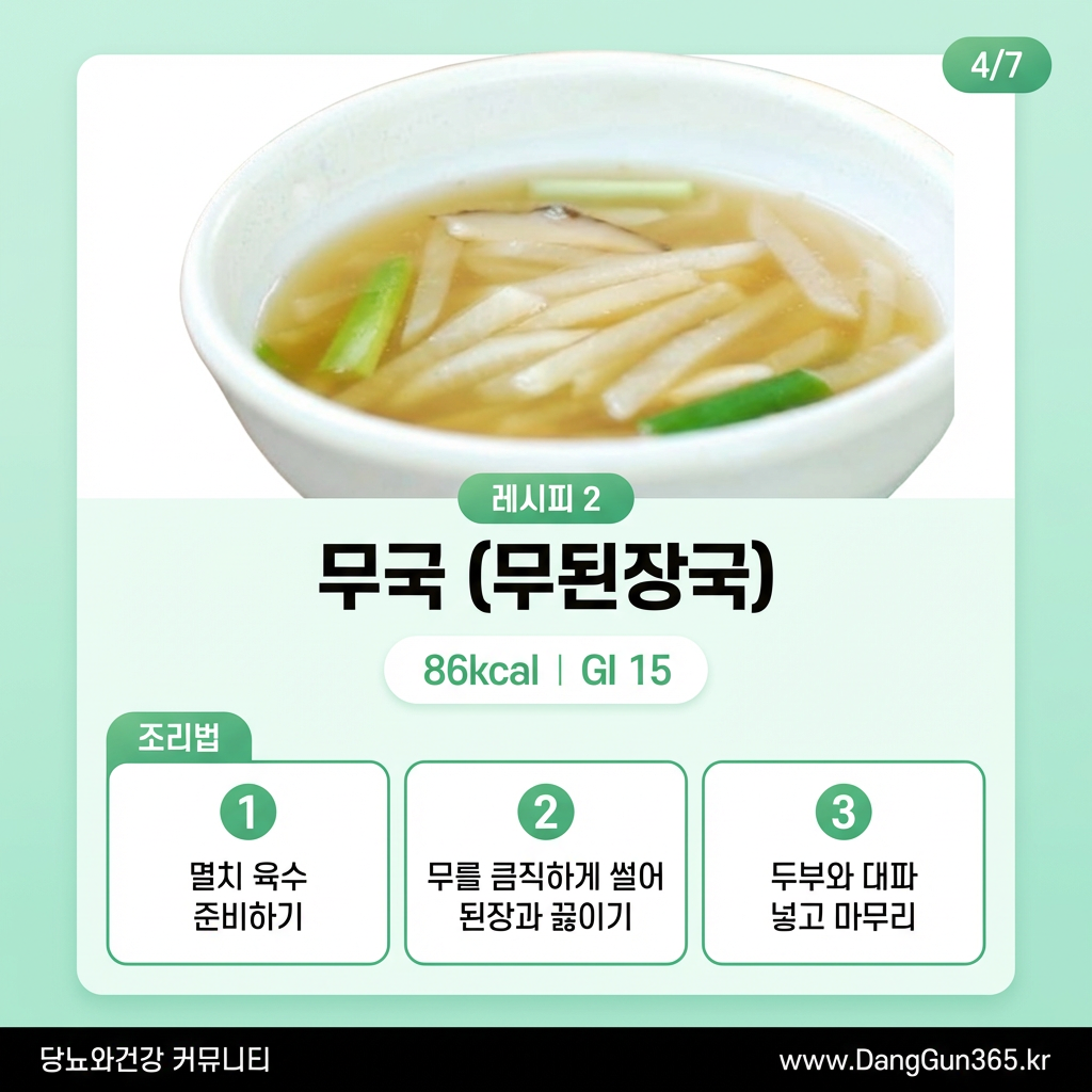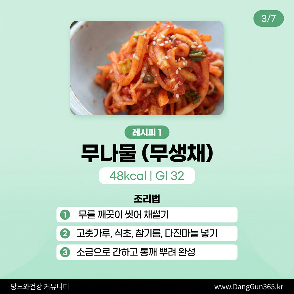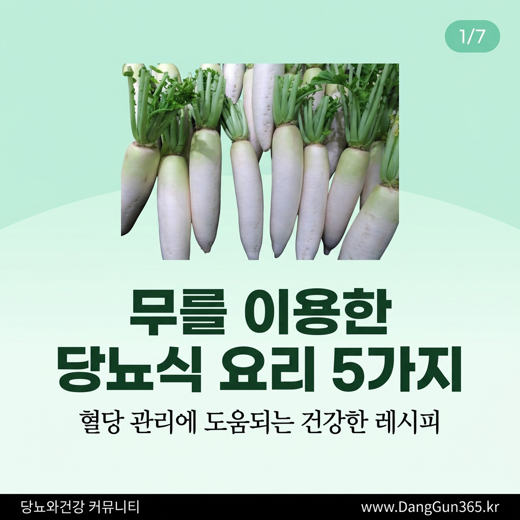 무는 수분 함량이 높고(약 95%), 칼로리가 낮으며(100g당 약 18kcal), 소화효소인 디아스타아제가 풍부해 당뇨 환자분들께 좋은 식재료입니다.