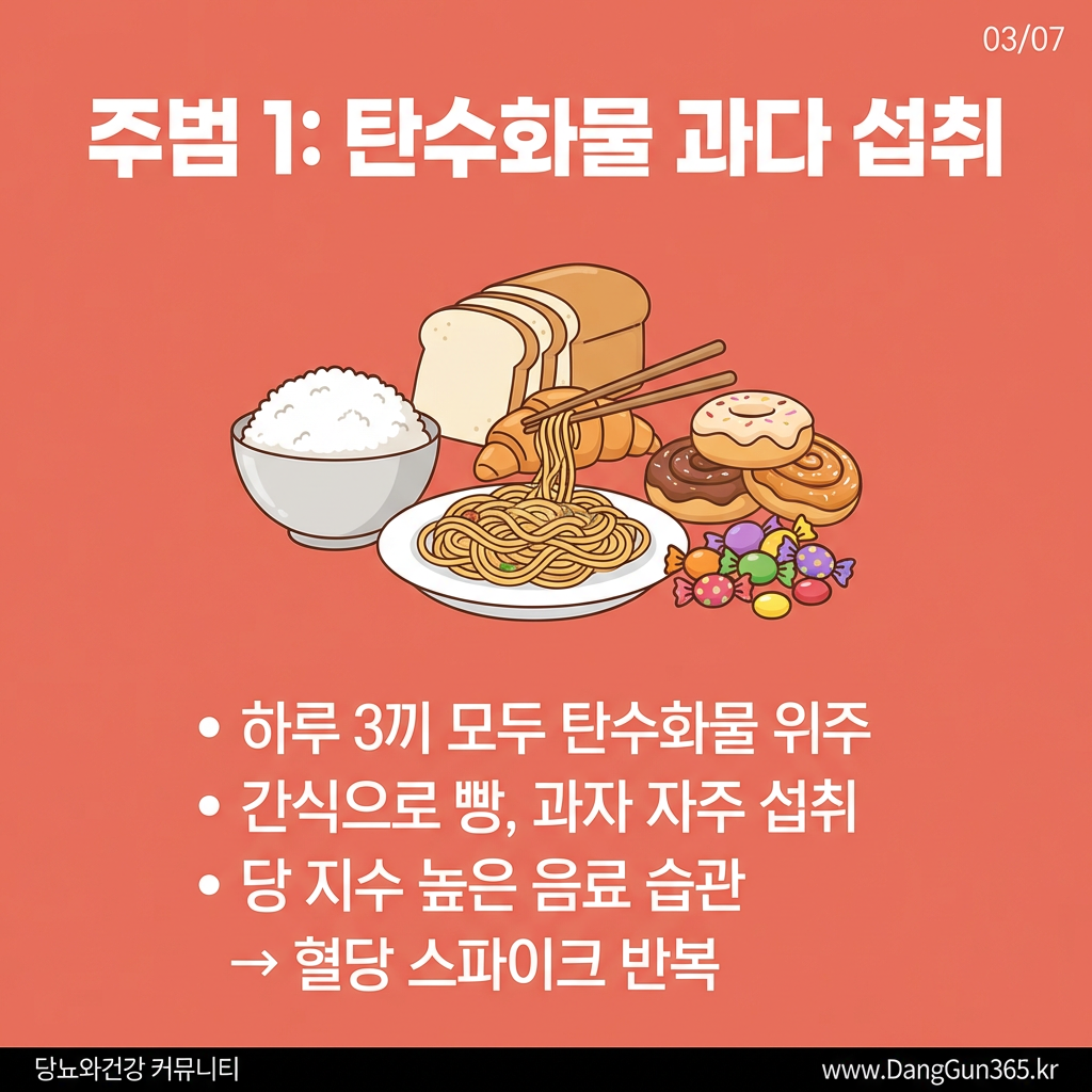 탄수화물 중심 식습관 – 빵, 면, 밥 등 정제된 탄수화물 위주의 식사가 혈당을 급격히 상승시킨다.