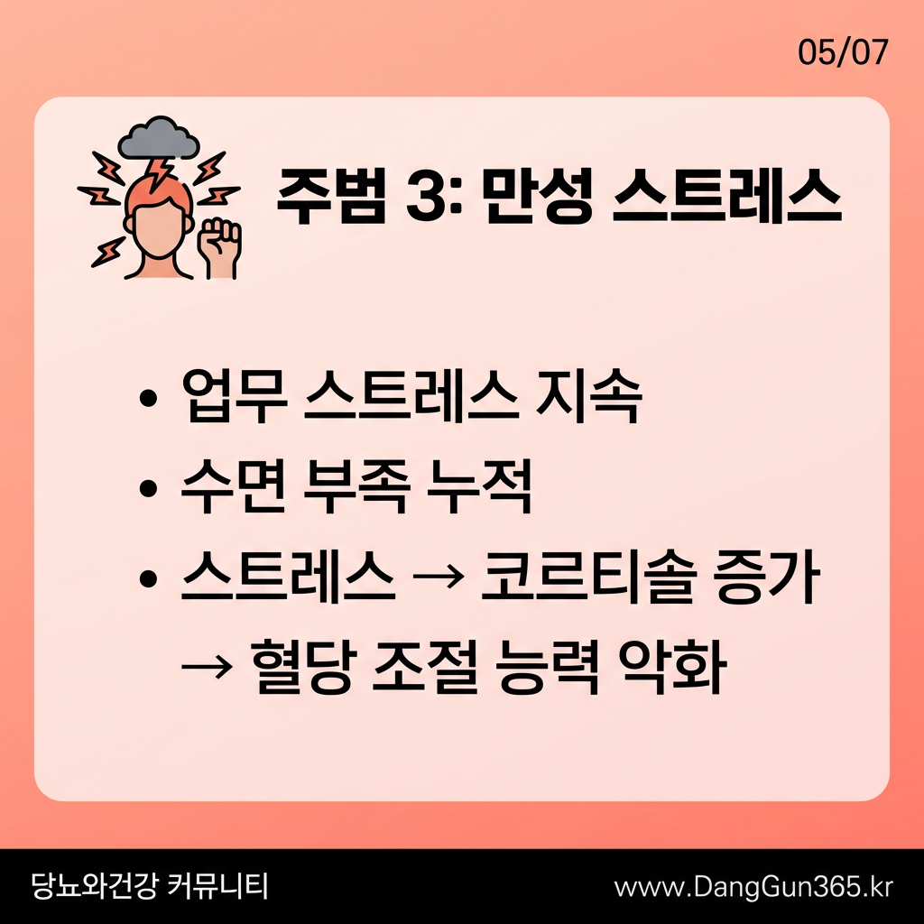 만성 스트레스 – 업무 과부하와 수면 부족이 코르티솔 분비를 증가시켜 혈당 조절을 방해한다.