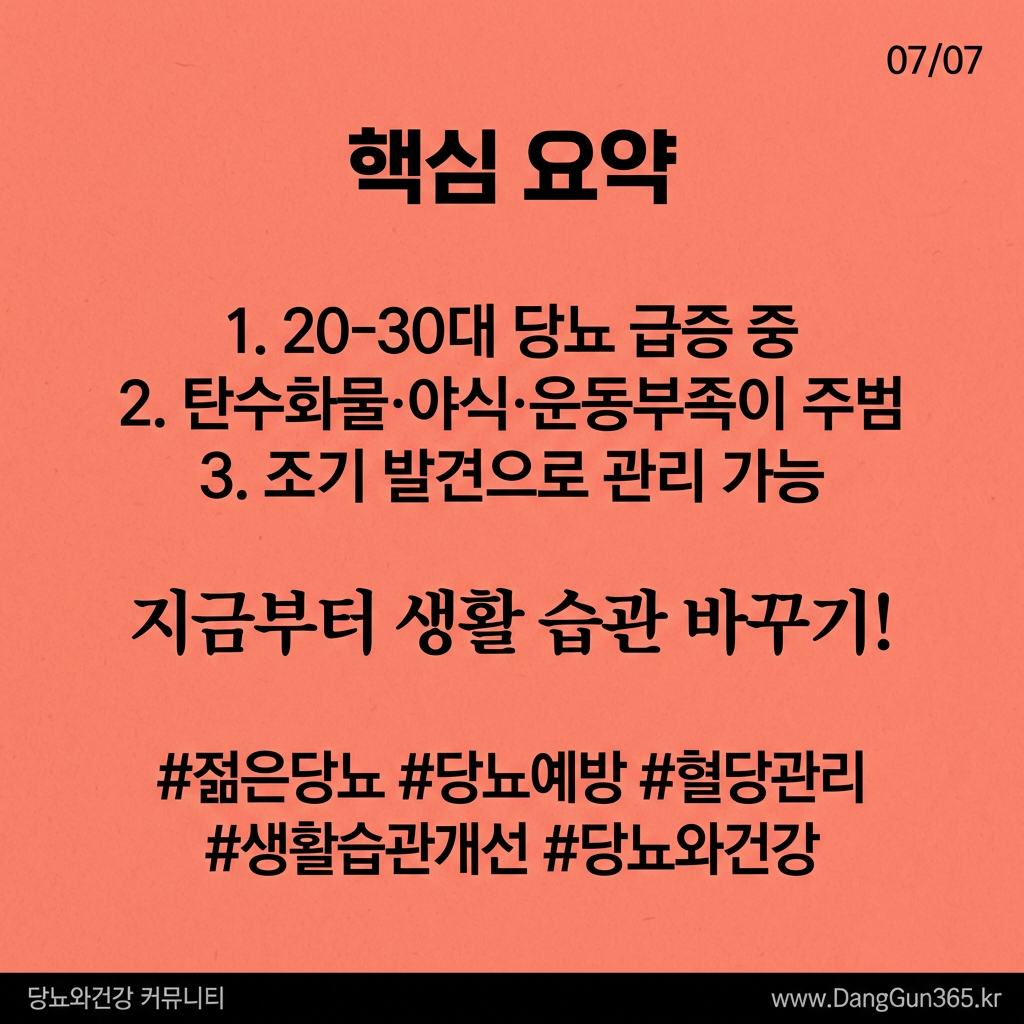 당뇨병은 더 이상 중장년층만의 질병이 아니다. 20대와 30대 젊은 층도 생활 습관을 점검하고, 정기적인 혈당 검사를 통해 조기 발견과 예방에 힘써야 한다. 작은 습관의 변화가 평생 건강을 지키는 초석이 될 것이다.