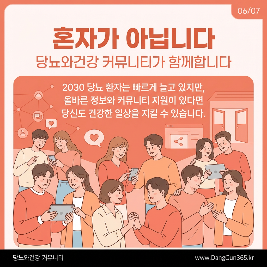 당뇨와건강 커뮤니티는 젊은 당뇨인들이 올바른 정보와 커뮤니티의 지지를 바탕으로 더 나은 삶을 만들어 갈 수 있도록 함께한다.