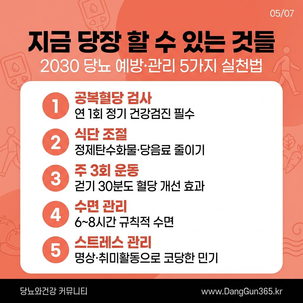 이와 같은 복합적 원인에 대응하기 위해 전문가들은 다음과 같은 생활 습관 개선을 권고하고 있다. 탄수화물 섭취를 줄이고 채소와 단백질 위주의 식단으로 전환하는 것이 첫 번째다. 하루 7시간 이상의 규칙적인 수면 확보, 주 3회 이상의 근력 운동을 통한 근육량 증가도 필수적이다. 또한 가공식품과 배달음식 섭취를 최소화하고, 연 1회 이상 공복혈당 검사를 통해 조기에 이상 징후를 발견하는 것이 중요하다.