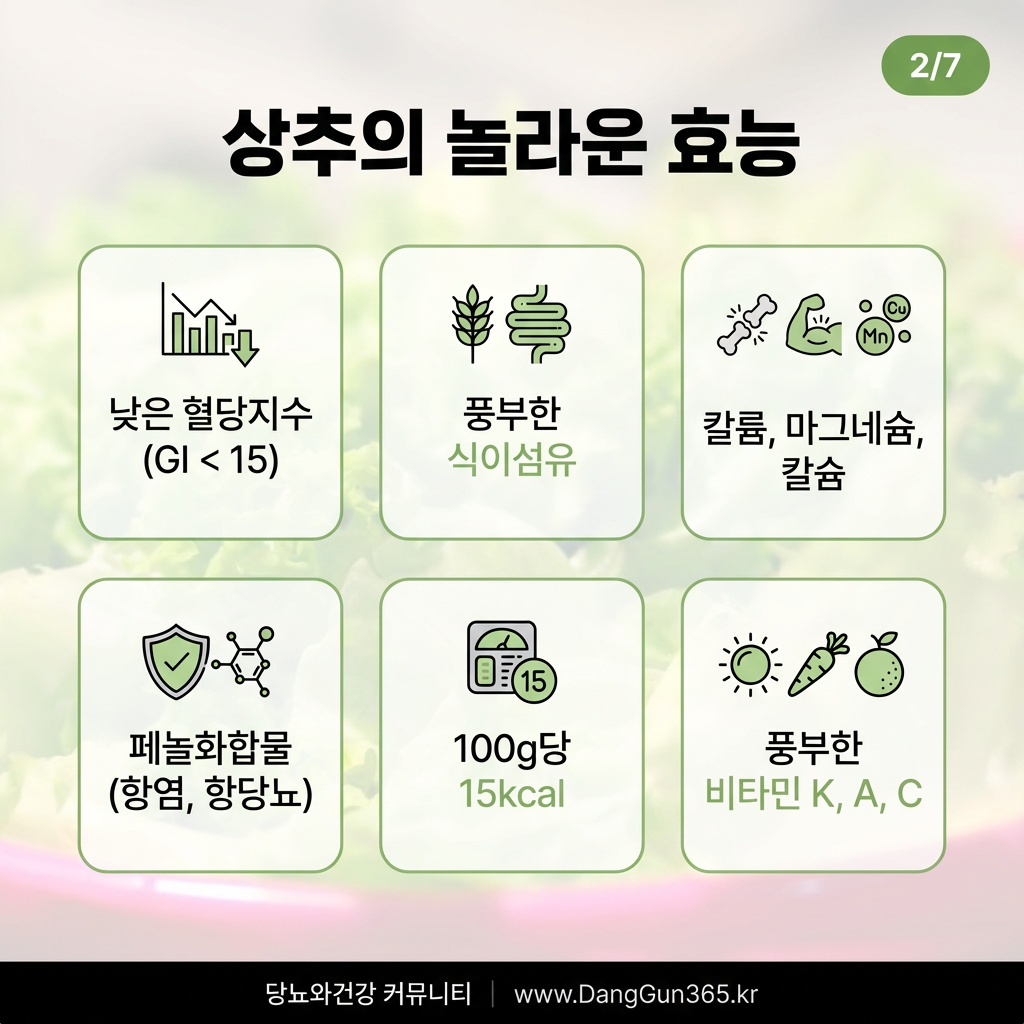 상추는 혈당지수(GI)가 낮고 식이섬유가 풍부해 혈당 상승을 완만하게 합니다