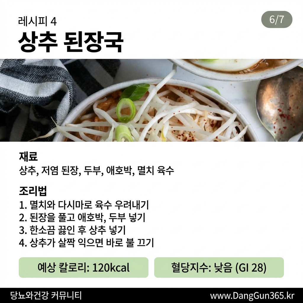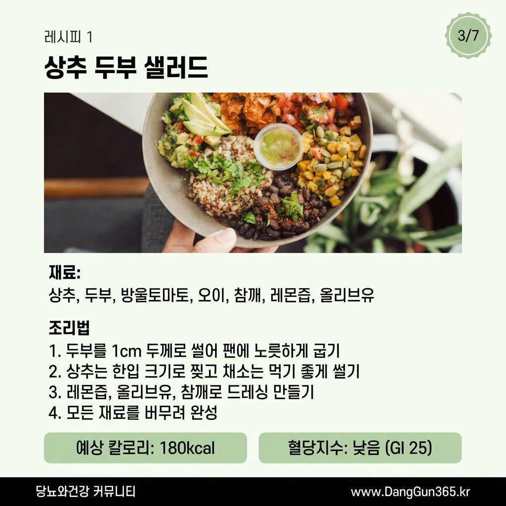 이 레시피들은 모두 저탄수화물, 고식이섬유로 구성되어 있어 혈당 관리에 도움이 됩니다. 맛있게 드시고 건강 관리하세요!