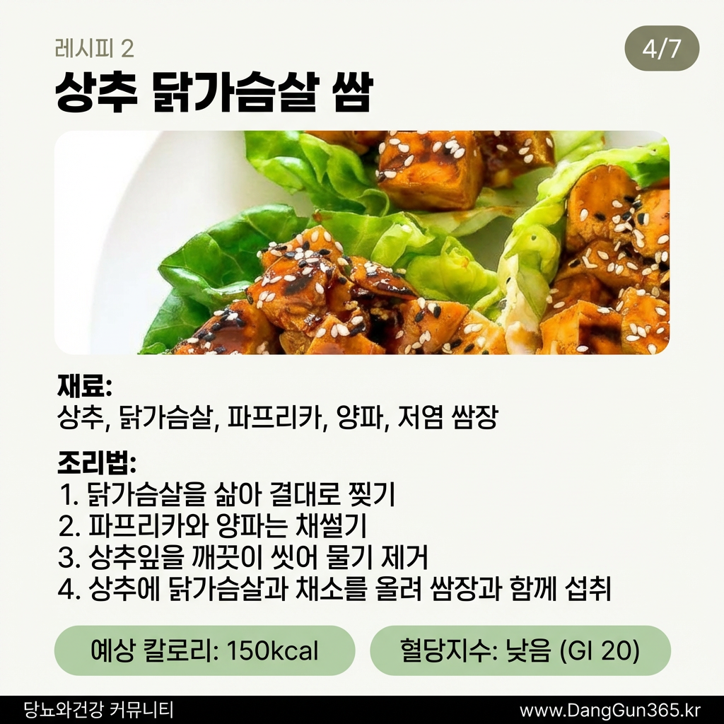 조리법: 닭가슴살을 삶거나 구워 채소와 함께 상추에 싸서 섭취