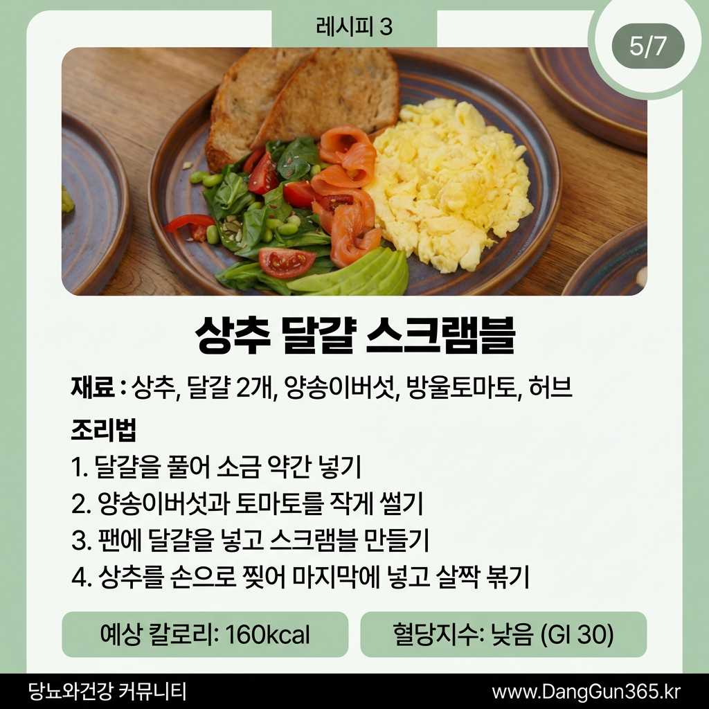특징: 아침 식사로 적합하며, 달걀의 단백질과 상추의 식이섬유가 혈당을 안정시킵니다.