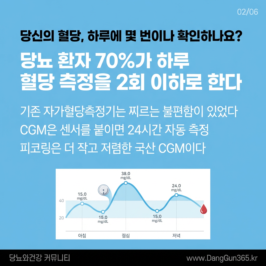 당뇨병 환자에게 혈당 측정은 하루에도 수차례 반복해야 하는 필수 과업이다. 그러나 손가락 끝을 찌르는 채혈의 불편함은 많은 환자가 측정 횟수를 줄이거나 불규칙하게 관리하는 원인으로 꼽힌다. 국내 조사에 따르면, 당뇨 환자의 70% 이상이 하루 혈당 측정을 2회 이하로 시행하고 있다. 연속혈당측정기(CGM, Continuous Glucose Monitor)는 이 문제를 근본적으로 해결하는 기술이다.