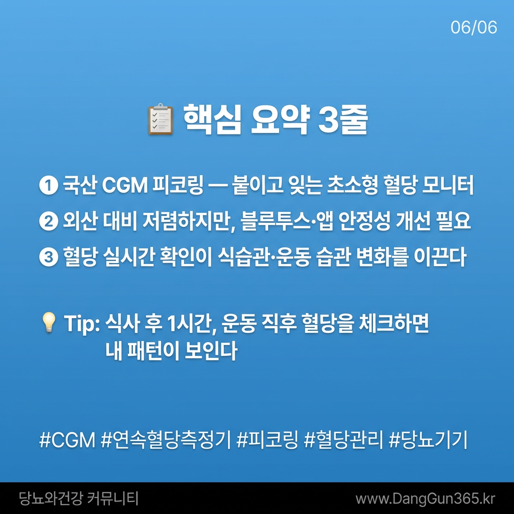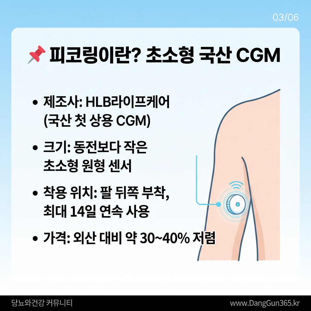 HLB라이프케어가 2026년 출시한 '피코링'은 국내 최초 상용 소형 CGM이다. 동전보다 작은 원형 센서를 팔 뒤쪽에 부착하면 최대 14일간 24시간 실시간 혈당 수치를 스마트폰으로 확인할 수 있다. 기존 덱스컴, 리브레 등 외산 제품과 동일한 원리이나, 가격이 약 30~40% 저렴하다는 점이 핵심 경쟁력이다.