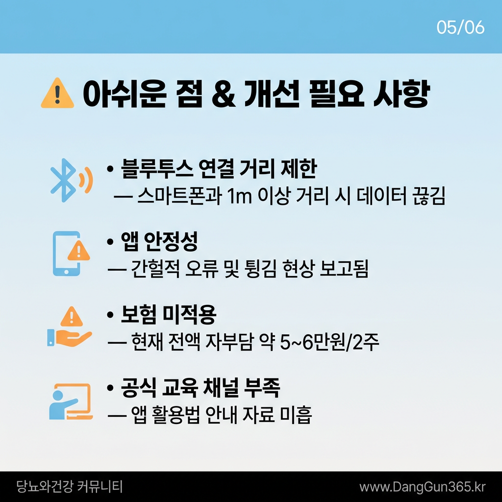 블루투스 안정성과 앱 개선이 이루어진다면, 국산 CGM 시장의 본격적인 확장을 이끌 제품으로 평가할 수 있다.
