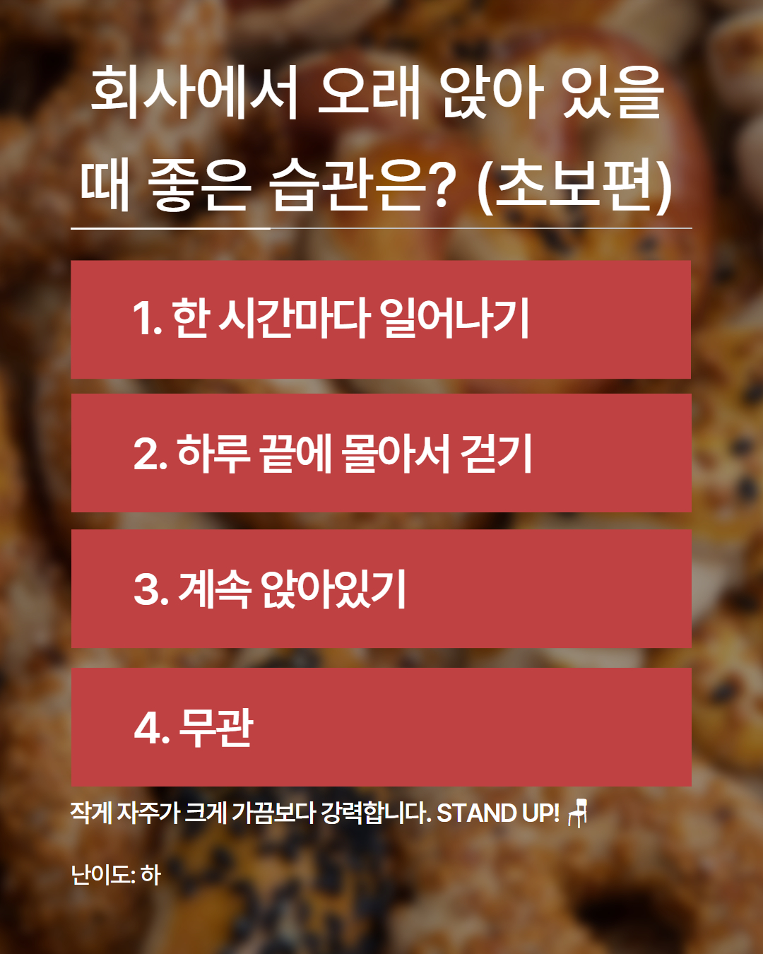 No13. 회사에서 오래 앉아 있을 때 좋은 습관은?1. 한 시간마다 일어나기2. 하루 끝에 몰아서 걷기3. 계속 앉아있기4. 무관힌트) 작게 자주가 크게 가끔보다 강력합니다. 난이도: 하