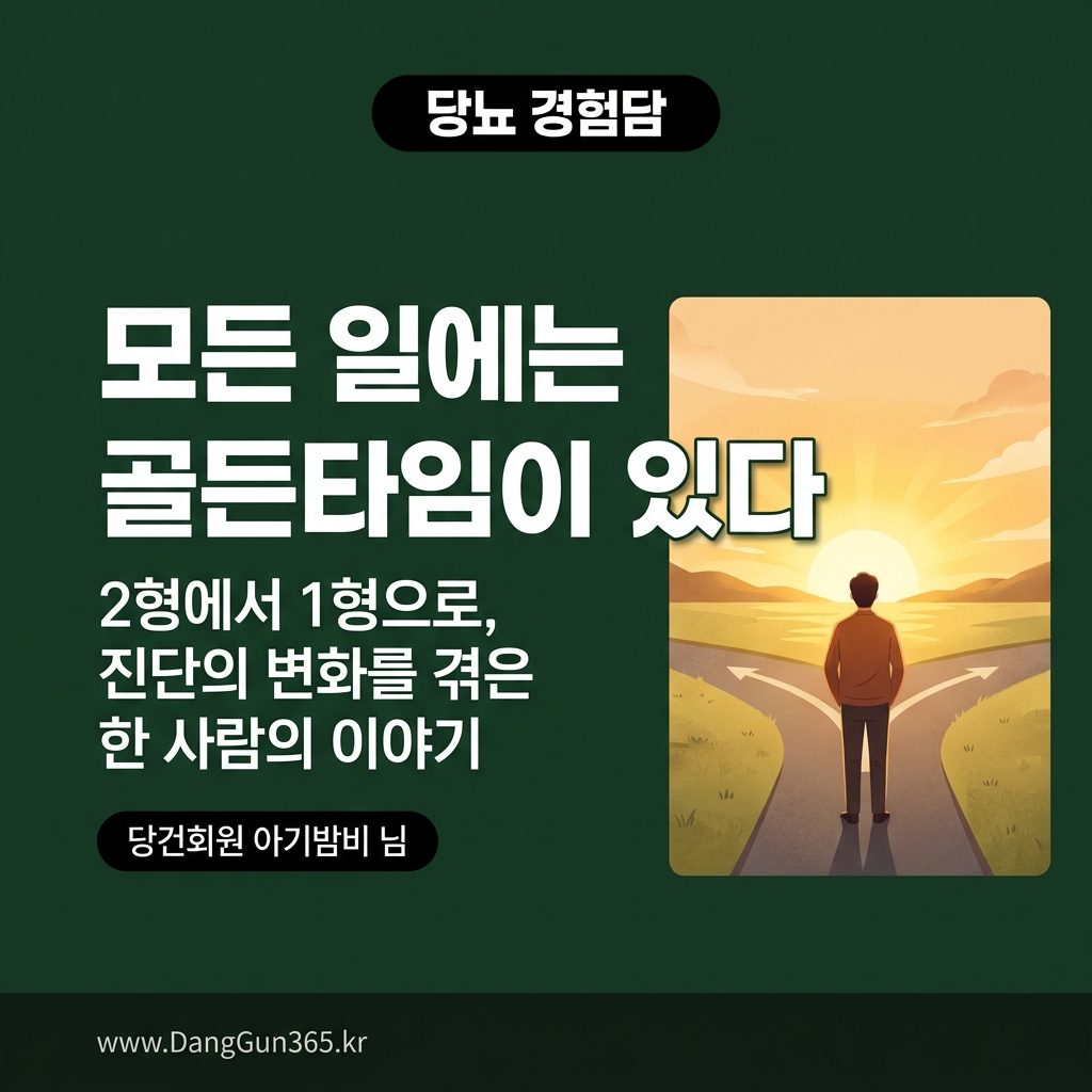 갑작스럽게 진단 변경이 된 당뇨. 이제는 2형 당뇨환자가 아닌 1형 당뇨환자로 전환되었다. 반갑지 않은 소식이지만 두렵게 느끼지 않으려 한다. 선택하고 고를 수 있는 것이 아니기에. 단지 아쉬움이 남는다. 남들처럼 열심히 관리했고 최선을 다해 수치를 5.3~5.5로 관리했는데도 불구하고 소리 없이 찾아온 1형 진단. 초기에 검사를 조목조목 받아서 조금 더 빨리 발견했으면 좋았을 텐데. 한 번씩 자기 전 누워서 그때를 생각한다. 한 달 동안 엄청난 스트레스로 우울증까지 찾아왔던 그 시점부터 몸이 급격히 안 좋아진 것인지 생각이 많아진다. 이미 받은 진단을 바뀔 수도 없고 미룰 수도 없다. 2형 당뇨관리와 또 다른 1형 당뇨 관리. 지금은 적응 기간이라 여러 가지 노력을 하고 있다. 이 생활이 빨리 익숙해져 심적으로 더 편한 날이 오기를 고대하며 하루를 보내고 있다. 달라진 상황에 예민하게 받아들이지 않으려 노력 중이며 골든타임을 놓치지 않으려 한다.