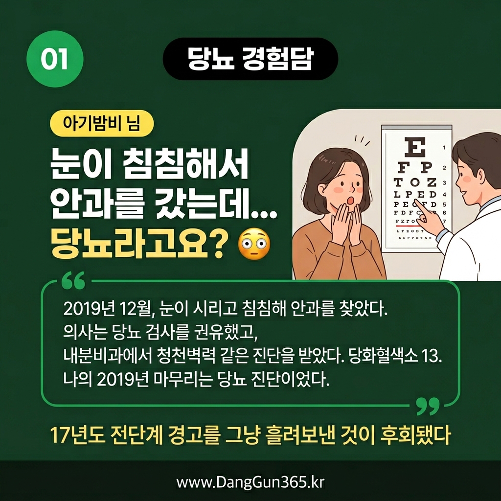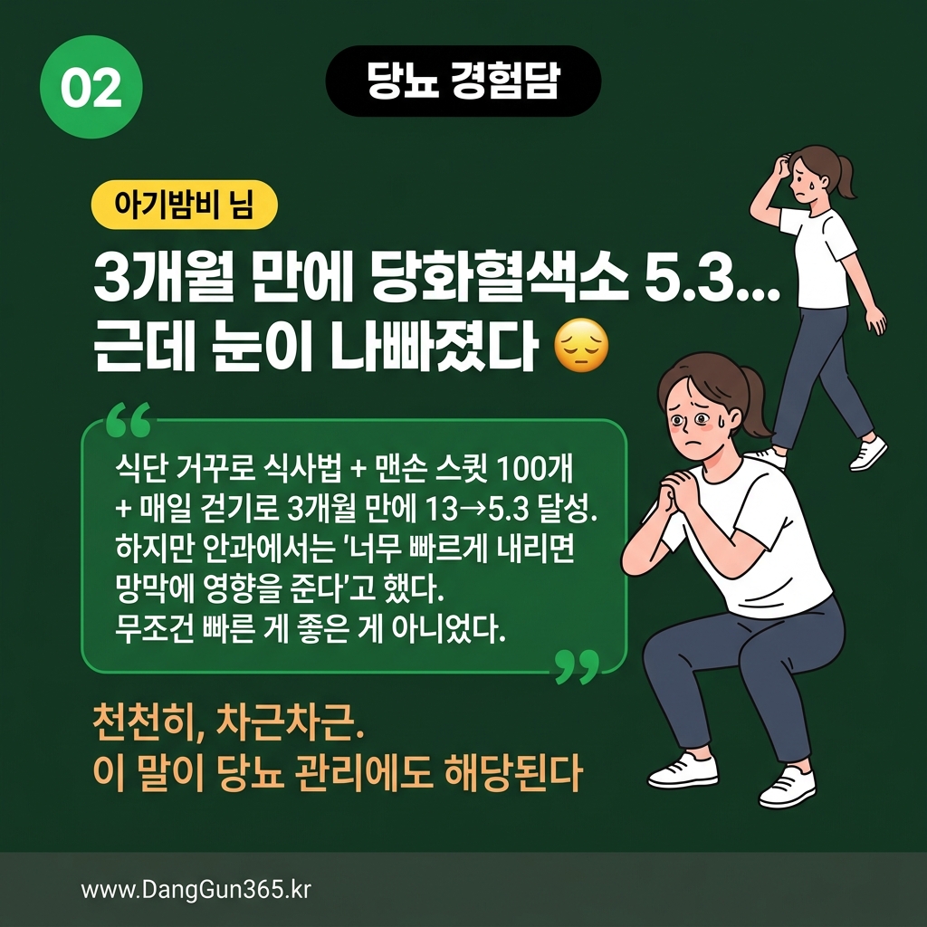 병원 입원 기간 동안 인슐린과 약을 병행하면서 치료를 받고 퇴원과 동시에 식단 관리를 했다. 식단은 거꾸로 식사법을 지키고 포화지방, 염분 섭취를 줄이며 시작했다. 식단 관리 후 운동은 자동 옵션으로 따라왔다. 맨손 스쾃을 100개씩 하고 걷기, 스탭퍼, 실내 자전거 등을 이용해 매일 같이 운동했다. 기저 인슐린을 맞았지만 운동과 식단으로 3개월 만에 당화 혈색소가 5.3으로 내려왔다. 수치가 내려와서 너무 좋았지만 눈이 말썽이다. 진단받기 전 갔던 안과를 방문했다. 당화 혈색소를 너무 빠르게 내린 것이 문제인지 망막 병증이 진행 되고 있다며 형광 안저 검사를 비롯한 합병증 검사를 했다. 결과는 좋지 않았다. 초기에서 중기로 넘어가는 시기라고 한다. 갑자기 나빠질 수 있냐고 물었더니 당화 혈색소를 짧은 시간에 급격하게 내리면 미세하게 시신경에 영향이 가서 그렇다고 했다. 운이 나쁜 케이스라는 말도 덧붙였다. 수치가 너무 높았기에 빨리 내리고 싶었을 뿐인데 눈이 안 좋아지다니. 무조건 빠르게 내리는 것이 다 좋은 게 아니었다. 뭐든 ‘천천히’ ‘차근차근’ 이란 말이 좋은 게 맞았다. 이 말은 질병 관리에도 해당되었다.