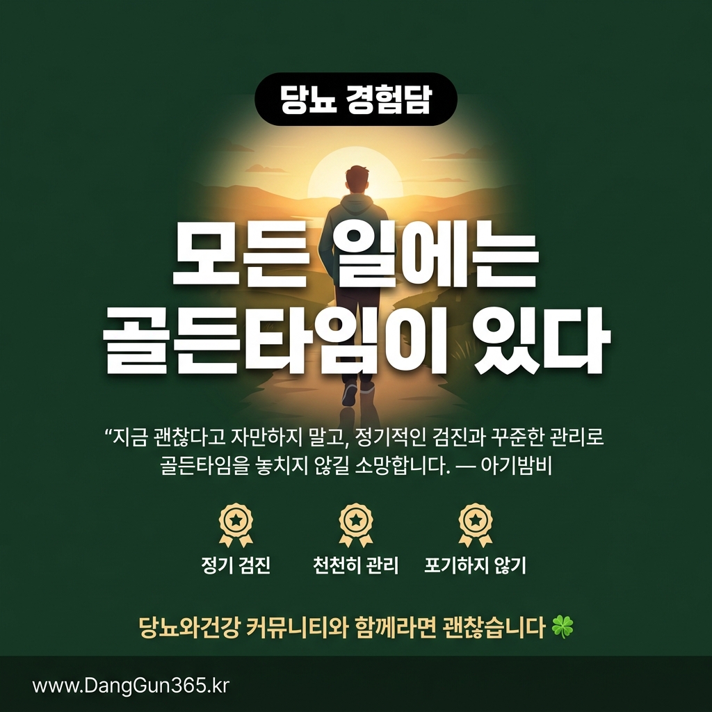 마지막으로 내가 생각하는 당뇨 관리는 조급해 하지 말 것. 한 번에 다 바꾸려고 하다 보면 보지 못했던 문제가 발생할 수 있는 것 같다. 관리를 하지 않아도 문제가 생기지만 조급한 마음으로 한다면 또 다른 상황이 생길 수 있다는 말이다. 조금 천천히 자기 몸과 타협하면서 서서히 하나씩 관리하는 게 더 좋다. 다이어트도 급하게 살을 빼면 피부도 늘어지고 요요도 빨리 오지 않는가. 똑같다고 볼 수는 없지만 원리는 같다고 생각한다. 인생도 타이밍이듯 관리도 마찬가지다. 속도 유지 필수. 그리고 평생 안고 살아야 할 문제이니 어느 정도 자기 삶과 타협하며 관리를 하는 것이 여러 가지 부작용을 막을 수 있다고 생각한다. 그게 최고인 거 같다. 모든 대사 관련 질병은 외상과 달리 소리 없이 찾아온다. 지금 괜찮다고 건강하다고 자만하지 말고 정기적인 검진과 관리를 꾸준히 하면서 모두 골든타임을 놓치지 않길 소망해 본다.